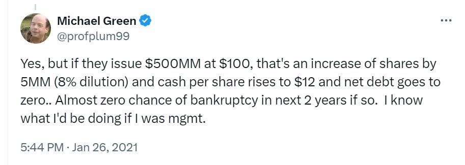Gill’s return, and the Gamestop ($GME) response, is a phenomenal introduction to an upcoming paper from Marco Sammon, one of the upcoming stars in academic finance. I’ll discuss his paper upon publication, but suffice it to say that Gamestop using the passive facilitated bubble to raise $3B in less than a month WHILE missing earnings is a brilliant example of how passive-facilitated share shortages are typically resolved by companies issuing shares. As a reminder, capital markets exist to facilitate the allocation of capital. If we abuse them, it ends with profitless retailers of second-hand video games receiving unrestricted funds for speculation. All else equal, this is inflationary for risk assets and deflationary for consumer prices (as retail operations are subsidized). Could this end well for Gamestop investors? Sure, perhaps Ryan Cohen is the 2nd coming of Warren Buffett. That he has done nothing so far with the $1B already in the bank is perhaps a warning against this… or maybe he just needed to start at scale… or maybe… The answer, unfortunately, is we can’t know. In the meantime, GME has become $3.5B in net cash attached to a $10B equity market cap. Operating losses of ~$50MM per year are easily covered. It’s going to be here for awhile now. Unfortunately the same thing I said in Jan 2021: