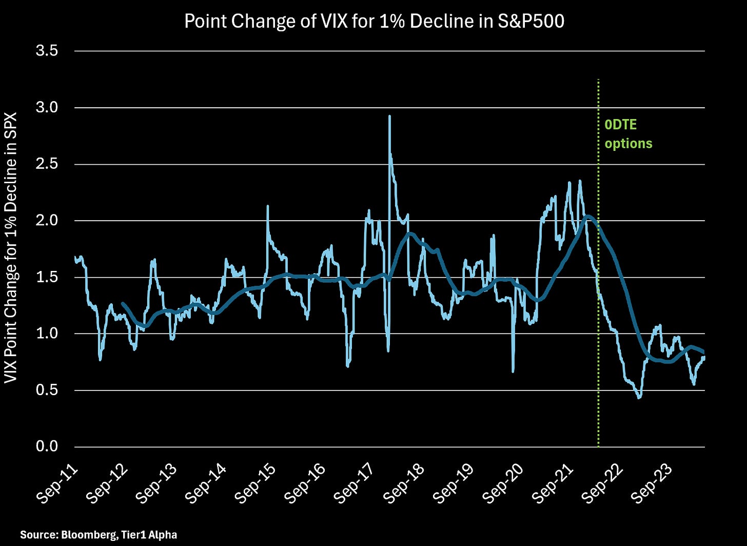 We can see this manifested in a major reversal in the trend of VIX “beta” to the S&P500. Most of you have seen my analysis of the Volmaggedon events of 2018. These were “predictable” to the extent that beta of the VIX had been rising against the S&P500 as the trade became crowded. A momentary flirtation with similar conditions in 2021-2022 ended with the growing popularity of 0DTE: