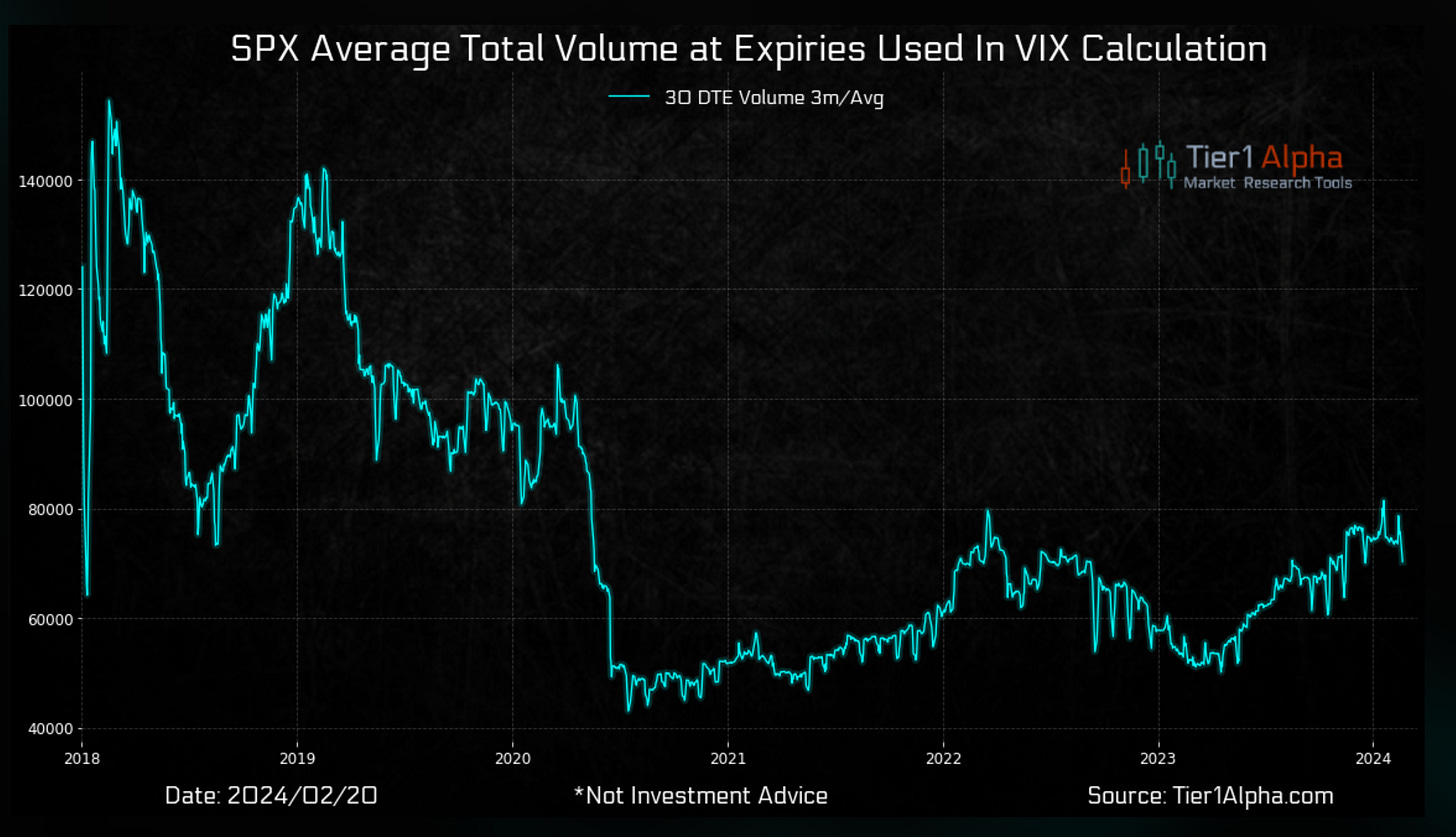My models of correlation have broken down since the advent of 0dte options. This appears to be driven by a structural change in how hedging (and speculation) is conducted. The absolute demand for index protection at the 30-day tenor (VIX) has collapsed relative to demand on single-day events. “Why pay for 30 days of vol when you can buy tomorrow’s Fed meeting?” While the CBOE has tried to downplay the importance of this shift, at Tier1 we’ve made it painfully obvious that while absolute option volumes are way up, volumes at VIX expiry dates are way DOWN from pre-2020:
