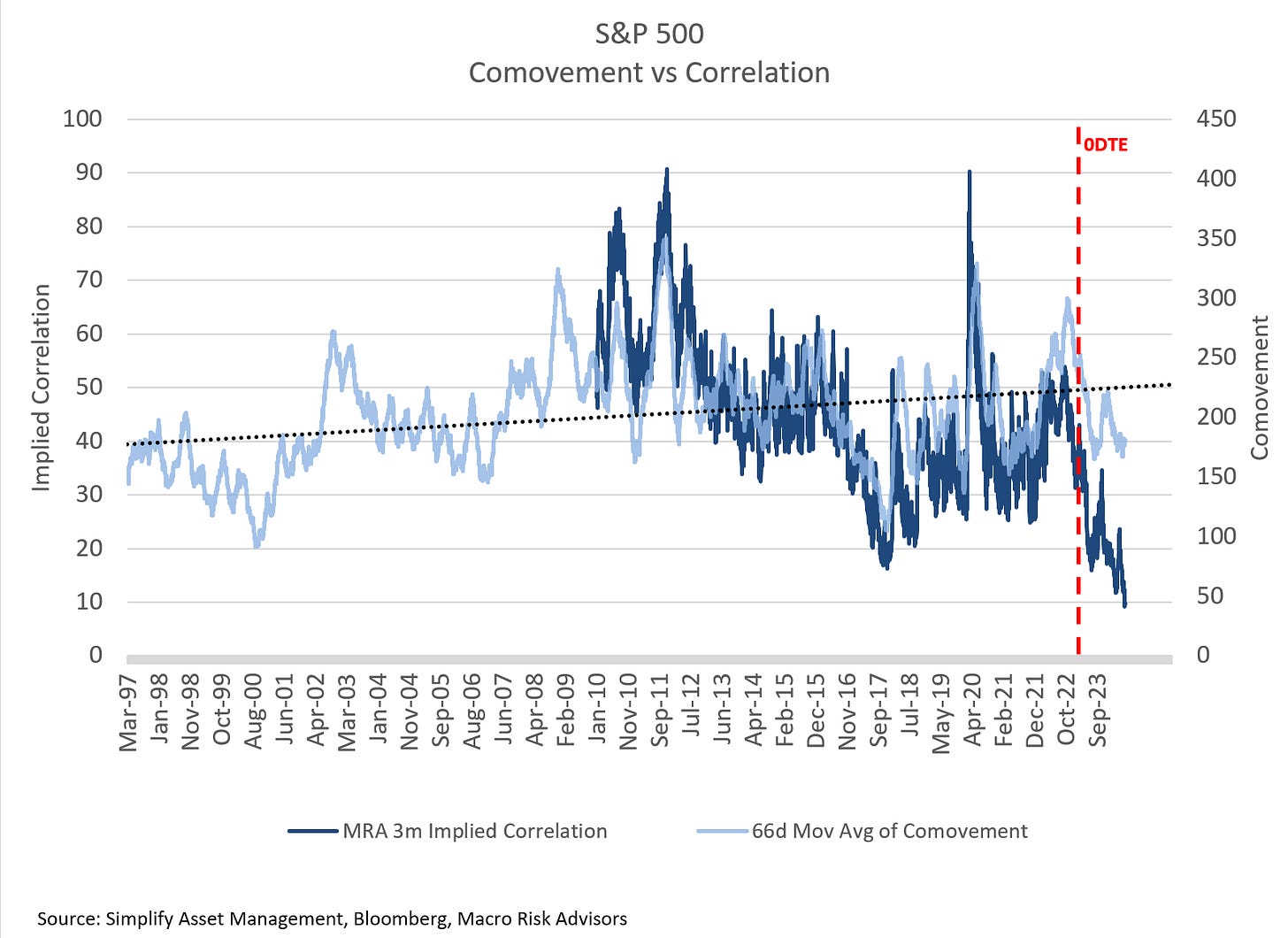 Impact of 0DTE Options: The rise of 0DTE (zero days to expiry) options has disrupted traditional correlation models, shifting hedging and speculation patterns. Demand for short-term index protection has surged, while 30-day tenor protection has decreased, affecting VIX behavior and implied correlation.