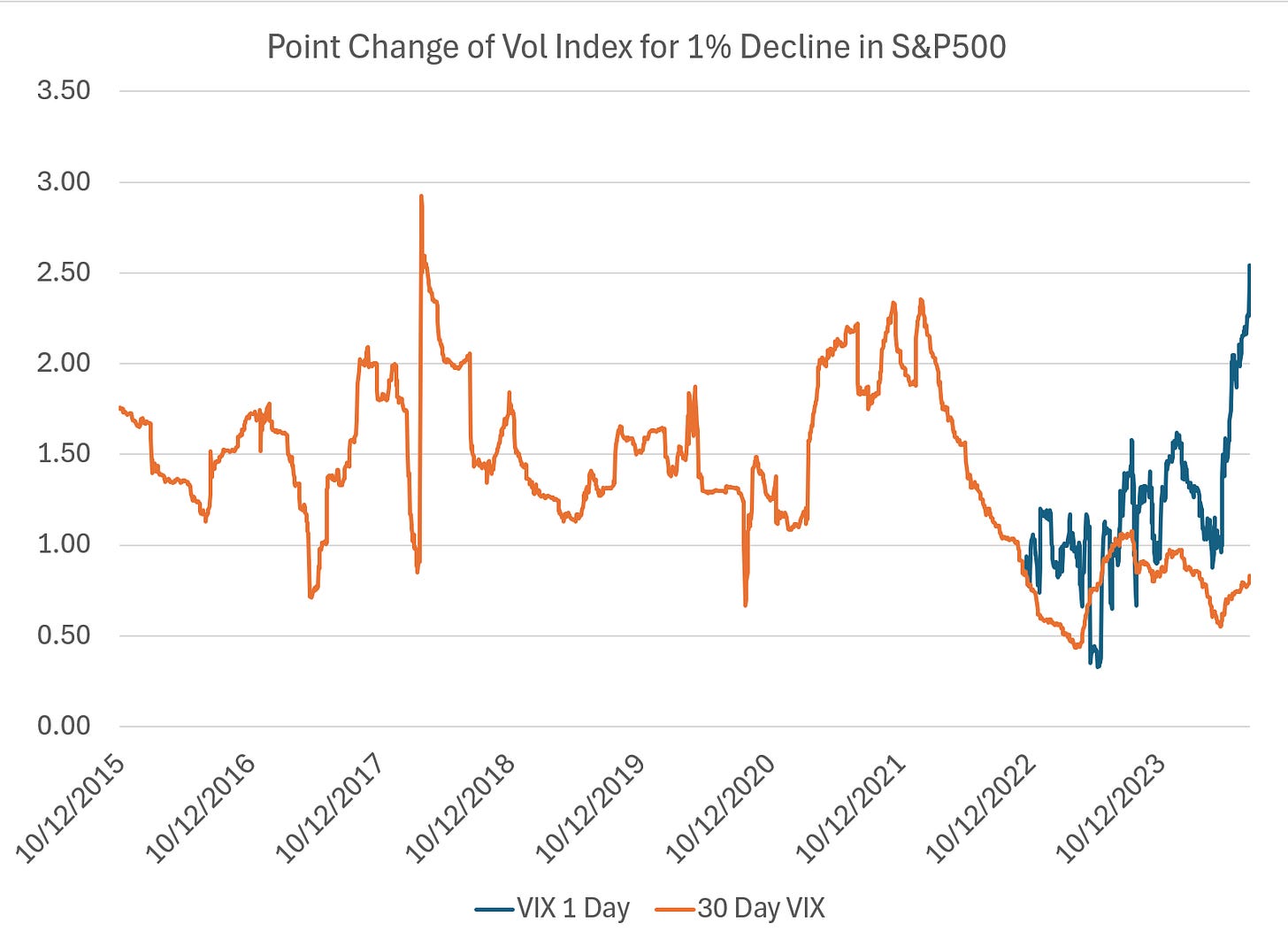 And so today, when I’m asked, “Doesn’t this look like 2017?” the answer has to be a touch of “No… but…” because we ARE starting to see an increase in responsiveness of the 1-day VIX. Whether the traditional VIX follows remains to be seen, but the odds are growing: