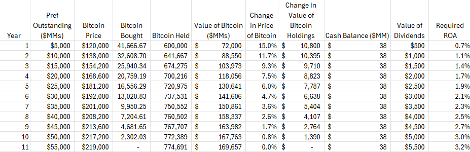 Except there’s that pesky cash dividend expense at ~10% that accumulates over time. To service this debt, Microstrategy will have to continually issue more convertible preferreds. It has explicitly stated that this is its strategy. So we can model it out: