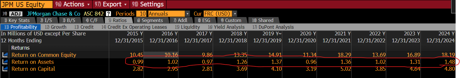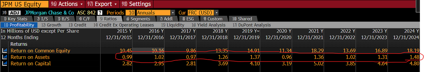 This strategy results in fewer and fewer Bitcoins being purchased as more and more shares are issued. Yes, the price of Bitcoin will rise (assuming no other sales), but the required ROA generated from that Bitcoin (not price gain, cash generated) rises as well. A 3.2% return? That should be easy… just lend the Bitcoin out like a bank. Yep… just like a bank, where the world’s best bank earns 1.5% ROA:
