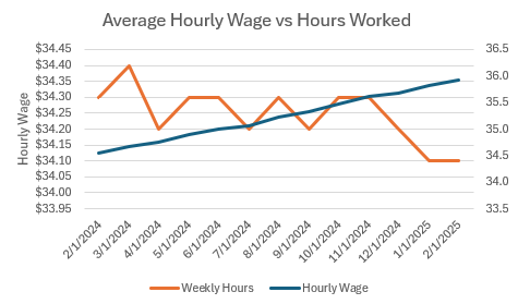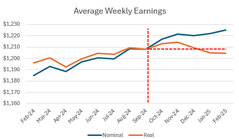 Real earnings are falling: While hourly wages have risen, average weekly hours are down, leading to lower real weekly paychecks.