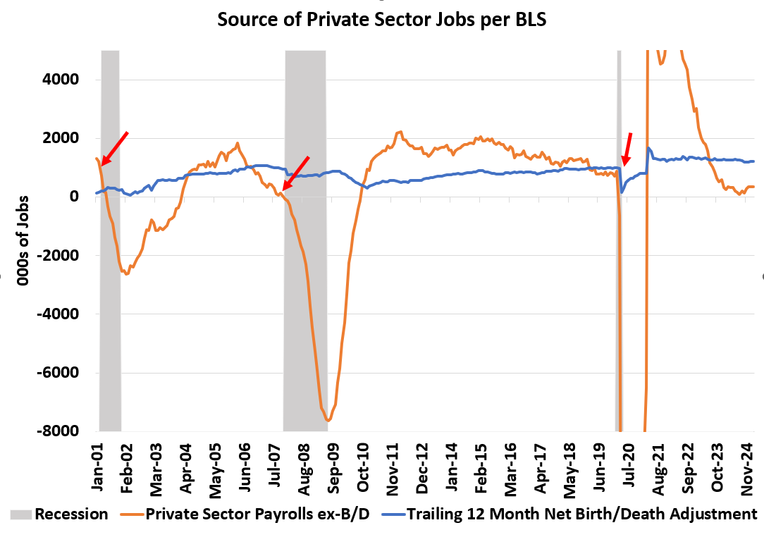 First, “employers” have not added 191K jobs a month. Adjusted for the completely discredited Birth/Death model, which will be mechanically revised starting with the March employment report to more closely reflect the structurally lower rates of business formation we have seen from the QCEW/Business Employment Dynamics surveys, private sector job creation did pick up slightly — to ~41,500 per month, not 191,000.