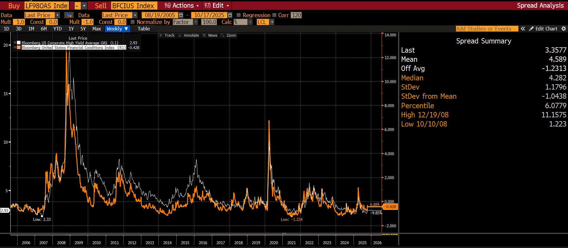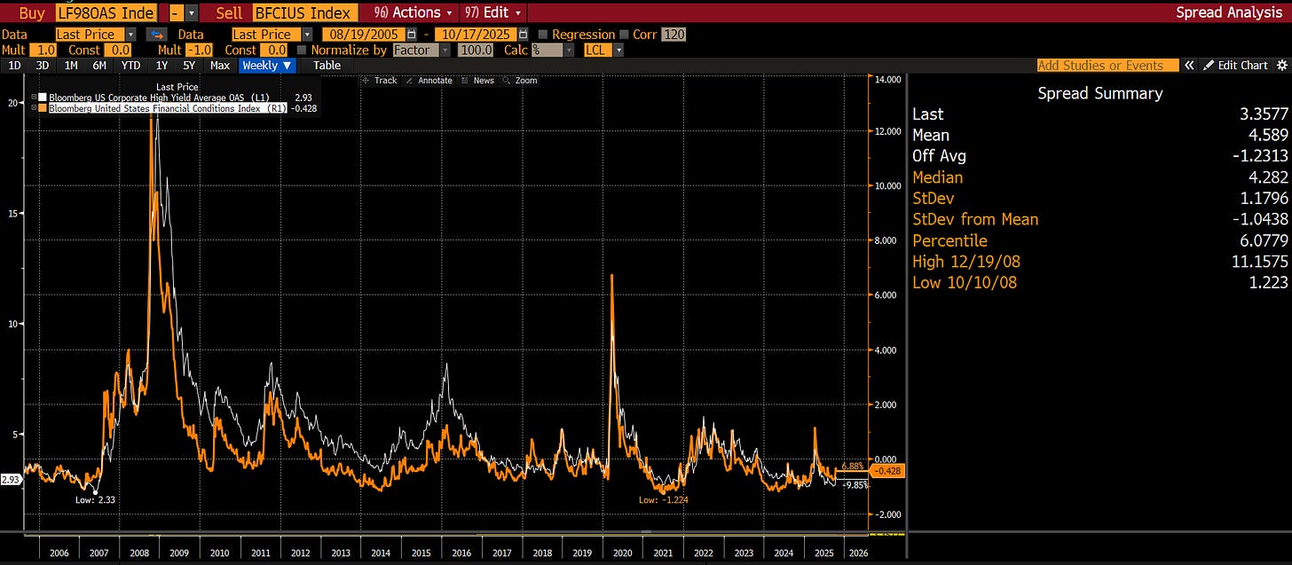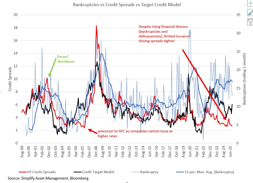 Loans made in 2016 and 2017 are going bust with 100% loss? HOW? Subordinated collateral? Just like First Brands. Fraud? Tricolor. A pattern is emerging that supports interpretation two: faced with a massive influx of capital over the past decade, private credit and private equity “spent” like drunken sailors; and now the hangover is due. Frauds are exposed when financial conditions tighten. I realize many of you like to use the “official” definition of financial conditions, which are ostensibly loose as a goose. But financial conditions are just credit spreads, and credit spreads are wrong as weak primary issuance has led to secondary market buying activity in dedicated credit funds. Last time credit spreads were this tight? June 2007: