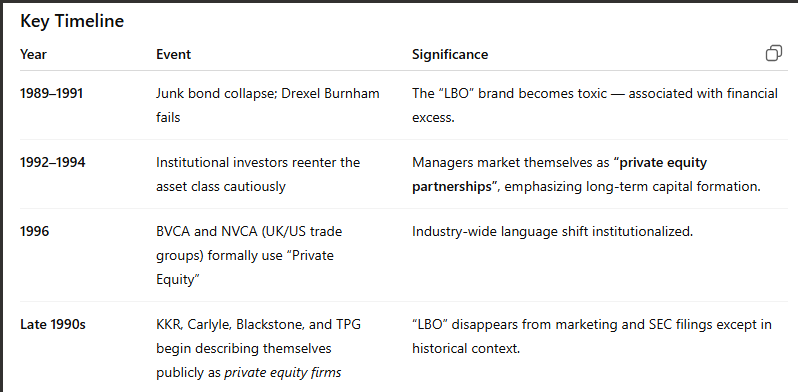 As most know, even if they don’t explicitly monitor it, “private equity” is simply “levered equity” with extra fees. Following the RJR Nabisco debacle, “LBO” became a poor calling card for insitutional investors; so they rebranded: