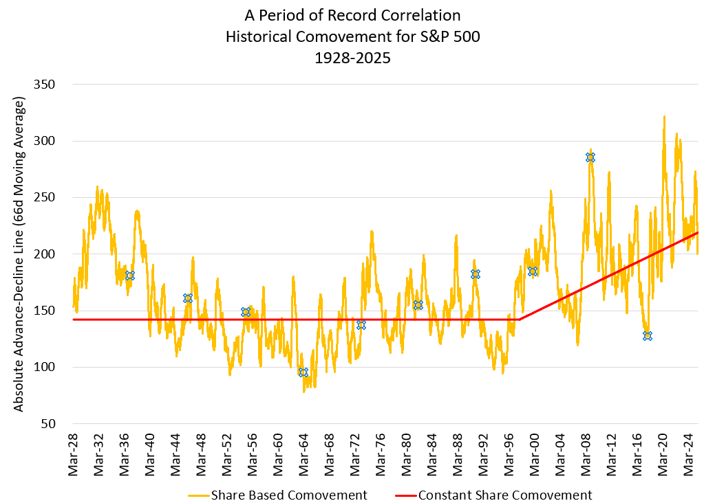 The chart above tracks “comovement” — how many stocks in the S&P500 are moving in the same direction on any given day. It normally tracks correlation, which is a more refined measure that includes amplitude of movement and weights; it has not done so recently: