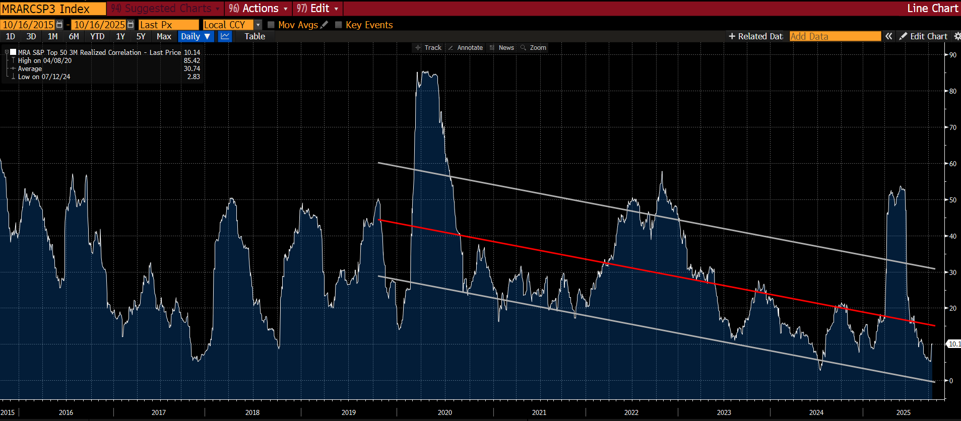 This chart has been problematic because my models suggest correlation should be rising. And it has for the median stock: