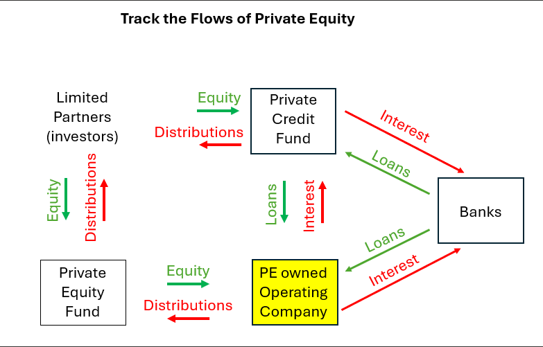But that’s really the only thing that changed. Well, funding sources changed as well as the post-2008 era led to bank regulatory arbitrage. Funding low quality loans became capital intensive and banks backed off. Today, the majority of funding for LBOs comes from “private” credit. Now private credit SOUNDS like a credit fund, but remember limited partners (LPs) don’t lend money, they invest equity; that equity gets levered. How? It’s banks all the way down: