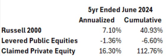 The private market has taken many slings and arrows over the past few years, from volatility laundering to concerns about mismarked assets. I pile on. The claimed performance for the sector is simply absurd: