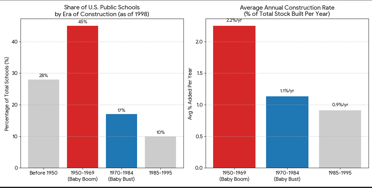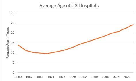 With declining high school populations, the issue was one of neglect. But a much bigger problem faces us for the rapidly aging (and dying) Boomers — we also built hospitals for their BIRTHS (peak hospital construction permits in 1964), but now expect those same deaths to occur with aging hospital infrastructure: