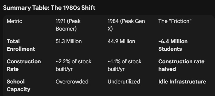 Yes, EVENTUALLY we will get Optimus-type robots to care for Grandma, but like all innovations, its adoption will be driven by necessity. And the net beneficiaries of the capacity increase will be GenX — who were also the beneficiaries of the high school and college construction booms (“You think I’d get in to Penn today?” is the enduring refrain of my classmates as we fight for our children’s right to party like it’s 1989). The offset? They are politically weak enough that they will likely see heavy restrictions on “senior entitlements” while Boomers are grandfathered in. Doesn’t really matter; many GenXers won’t get to be grandfathers anyway (due to falling birth rates).