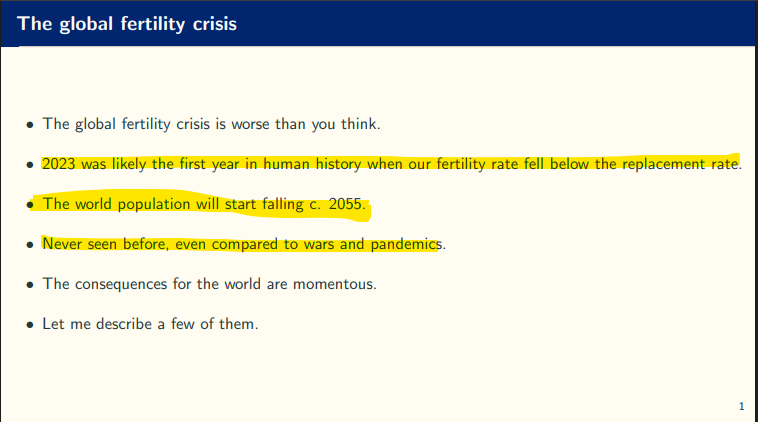 Replacement Rate Breached: “2023 was likely the first year in human history when our fertility rate fell below the replacement rate”.