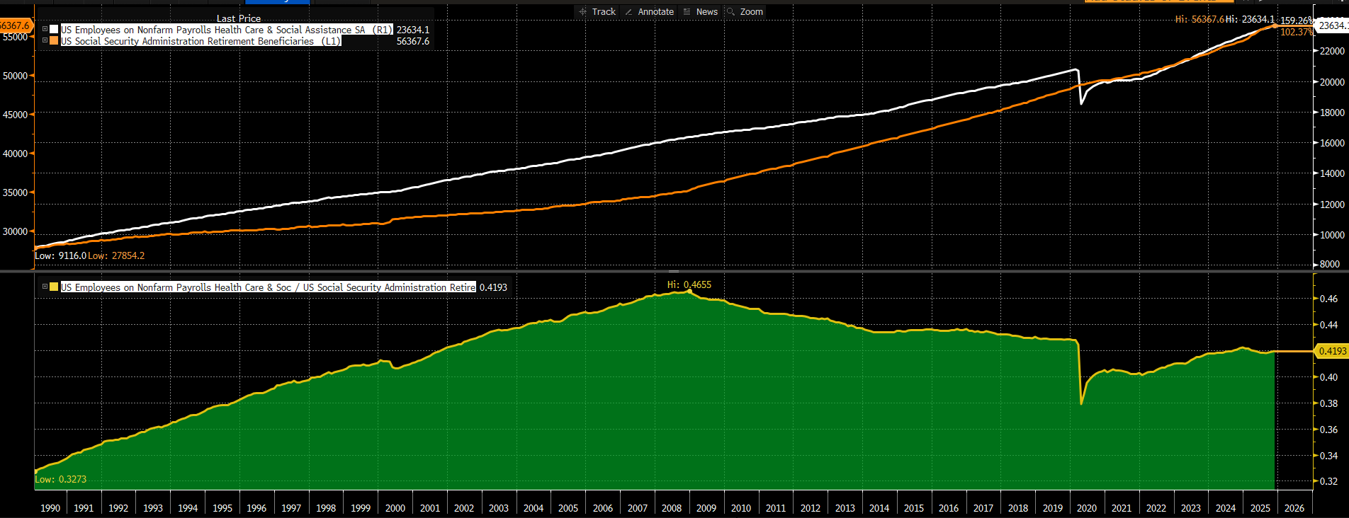 Just like senior housing, a capacity crunch is emerging in health care workers per Social Security beneficiary. As those SocSec beneficiaries age, the intensity of demand will rise, and the implications of the worker shortage will become more pronounced: