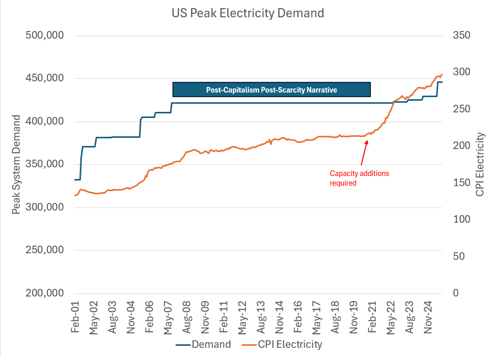 The “Local” vs “Global” cost curve: The idea that “marginal energy is free” once you install solar panels is a reflection of a local cost curve, not the global cost curve. If I install a 10kW panel array, 0-10kW is “near zero marginal cost.” But 10.0001kW is HIGH marginal cost. As a society, we experienced a period where the local curve did not need to shift to obtain new capacity and we mistook it for “post-scarcity”