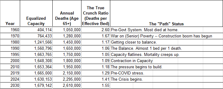 The net impact is a looming senior housing crisis that will necessitate a radical rethinking of end-of-life care. But first, we will face a capacity crunch that will force aging Boomers to pay for the labor needed to age in place, because there will be nowhere for them to go.