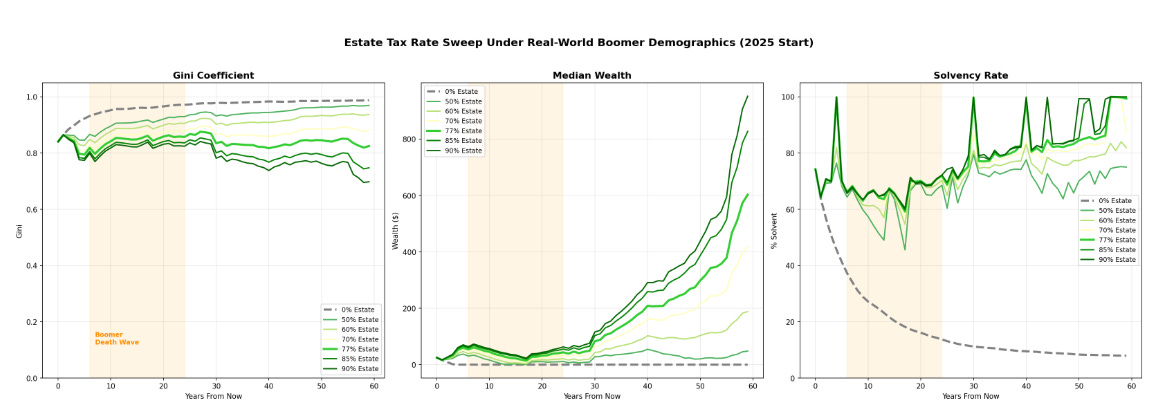 The Gini Coefficient still rises during the first 25 years of the Boomer death wave, even with a 50% estate tax. The dividend generated at a 50% rate is insufficient to push agents above escape velocity when wealth is concentrated in a single generational cohort rather than distributed uniformly across age groups.
