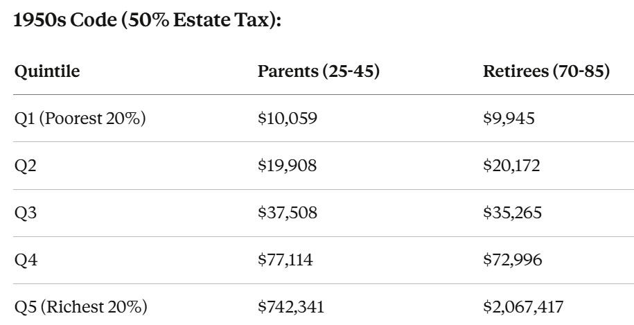 And look at the retirees. Under the baseline, Q5 retirees held $3.5 million, while every other retiree cohort held zero. Under the 1950s code, Q5 retirees still hold $2.1 million; they are still wealthy, but Q3 retirees hold $35,265, and Q1 retirees hold nearly $10,000. They can eat. They can live. They can care for grandchildren. They have dignity.