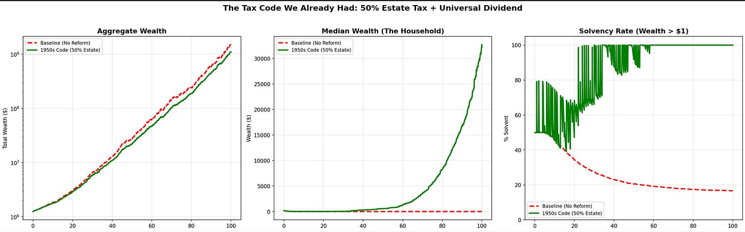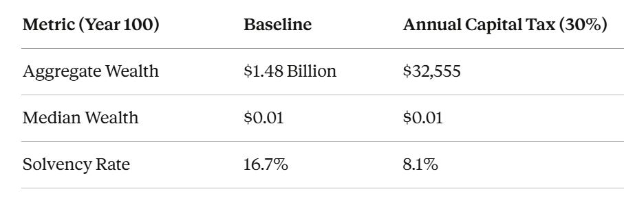 Did the policymakers who set that rate understand the mechanism revealed by our simulation? Did they know about absorbing barriers, escape velocity thresholds, and the minimum dividend required to overcome geometric compounding under concentrated wealth?
