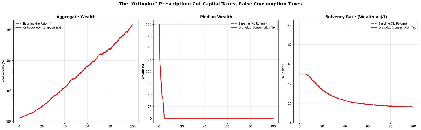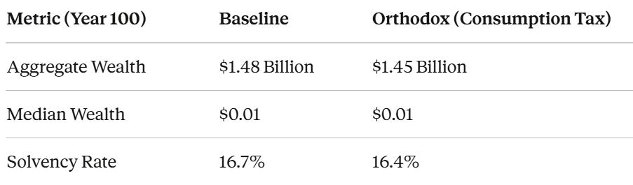 Here’s why. A consumption tax is functionally a tax on survival. In our model, every agent must “eat” — $50/year in non-negotiable cost-of-living. A 15% consumption tax raises that floor from $50 to $57.50. That’s $7.50 per year taken directly from the ability to form a buffer.