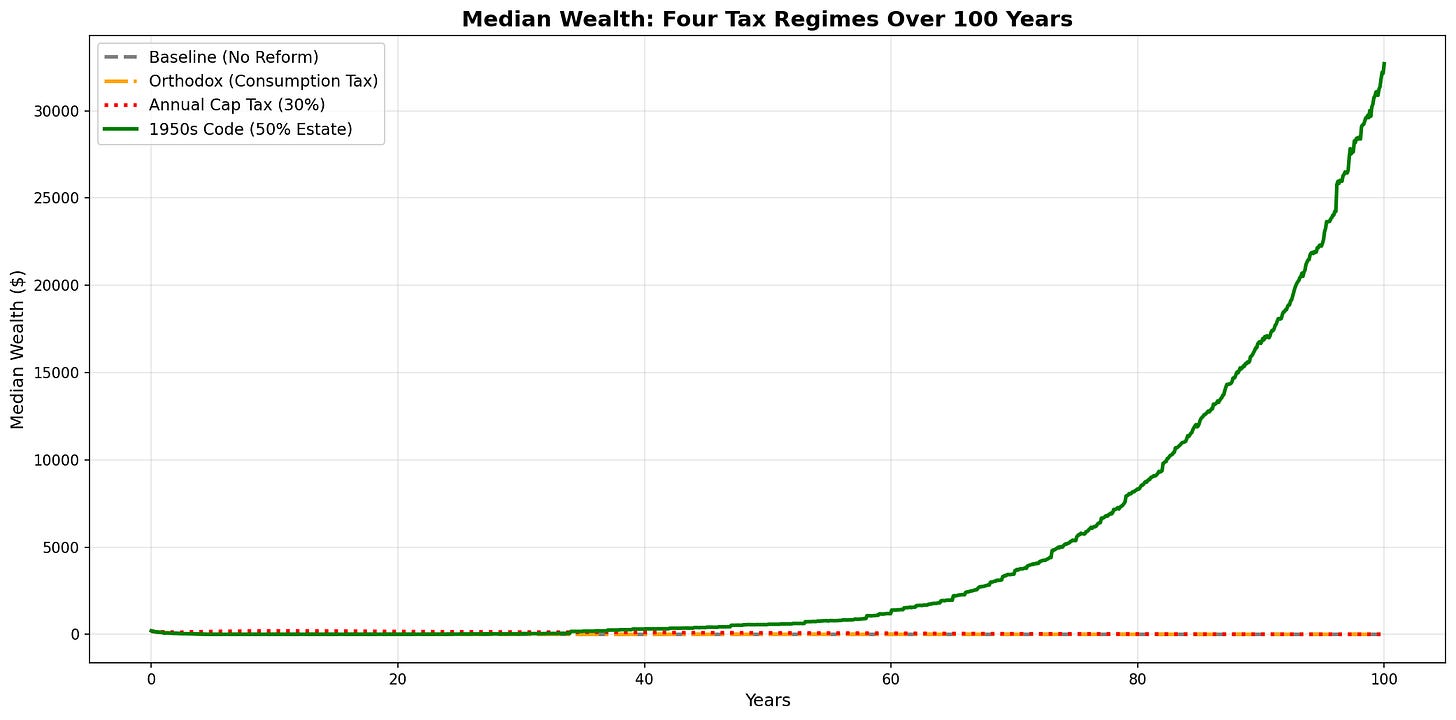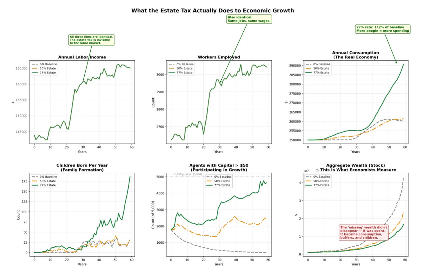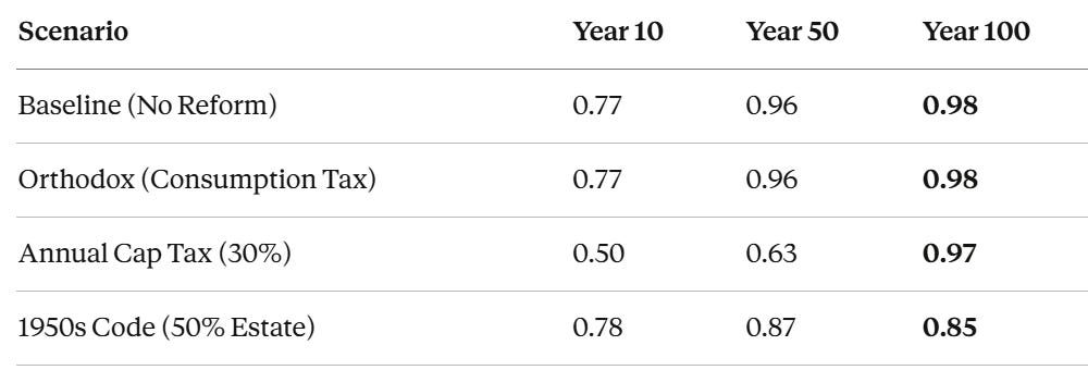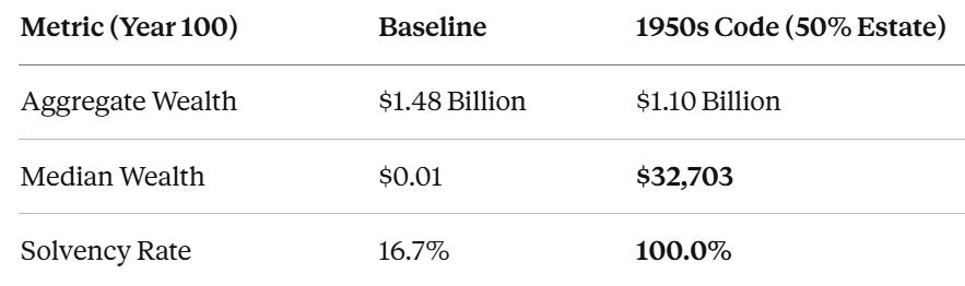The Gerontocracy doesn’t vanish entirely; older agents have compounded longer, and they should be wealthier. But the 50% estate tax reduces the dynastic acceleration that turns retirees into a separate economic species. It clips the tail of the distribution at the exact point where intergenerational transfer would otherwise create an aristocracy. The 77% rate “solves it.”