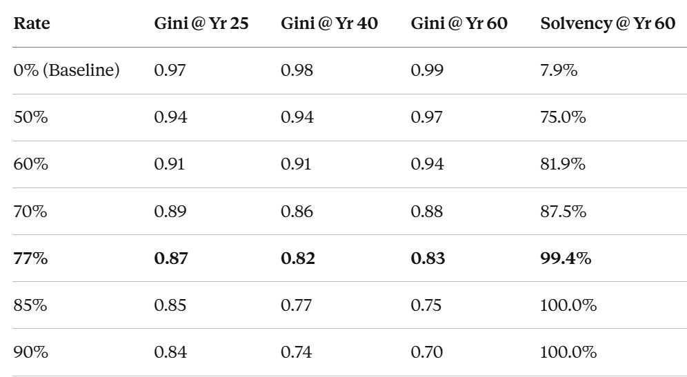 With Pillars 1-3 in place, the estate tax can finally function as the simulation predicts. A progressive estate tax reaching 77% on the largest estates — the actual rate that prevailed from 1941 to 1976 — with no step-up in basis, no GST exemption, no perpetual trust escape hatch. Revenue recycled as a universal buffer dividend. Our rate sweep under real-world Boomer demographics shows that 50% is not enough — it achieves only 75% solvency when wealth is concentrated in a single generation. The 77% rate is the critical threshold: the point at which the dividend just barely exceeds escape velocity for the bottom quintiles. Below it, the system improves but does not heal. At 77%, solvency reaches 99.4%, and the Gini inflects and reverses during the death wave.
