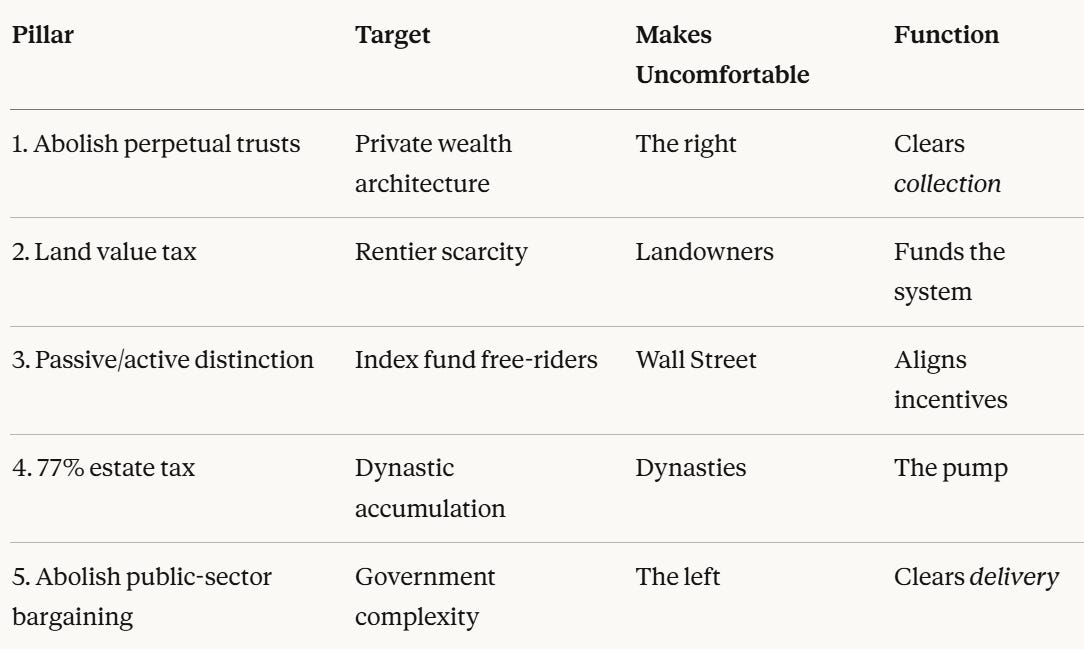 Pillars 1 and 5 are mirror images: one dismantles the private immortality architecture that blocks collection, the other dismantles the public complexity architecture that blocks delivery. Together, they create an unobstructed channel from the generational boundary to the citizen’s account. The estate tax is the pump. The pillars clear the pipes.