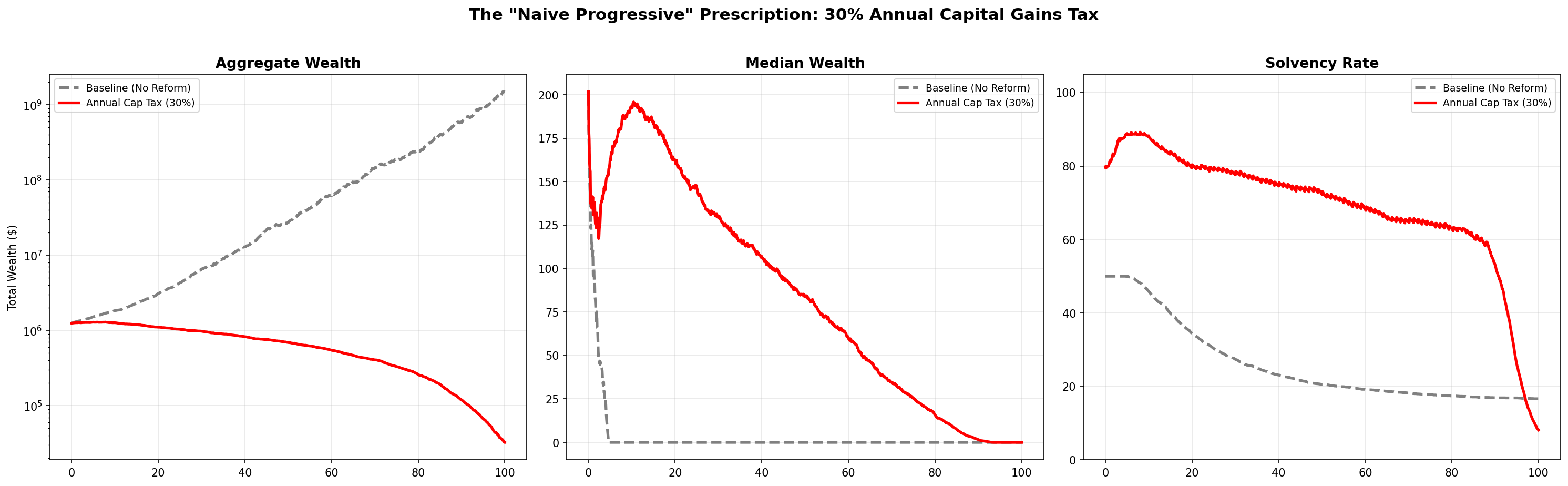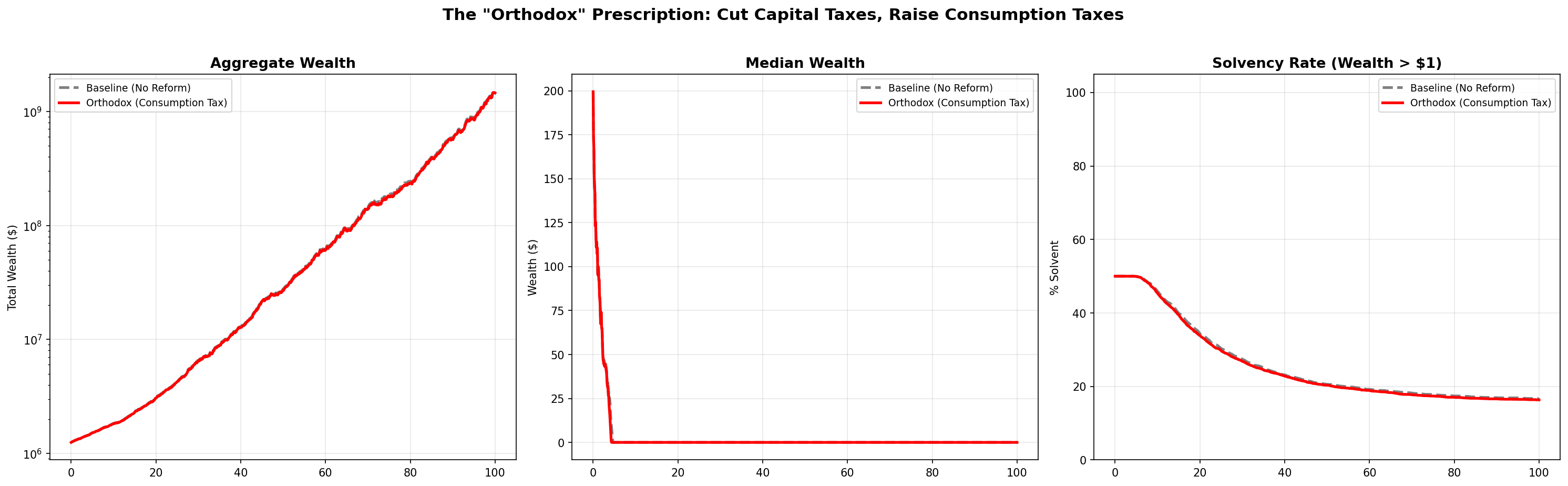 Read that again. The “optimal” reform made every metric worse. Aggregate wealth fell slightly (less capital formation from buffer-depleted agents). The median didn’t move — it was already zero. And the solvency rate — the percentage of the population with more than a dollar to their name — declined.