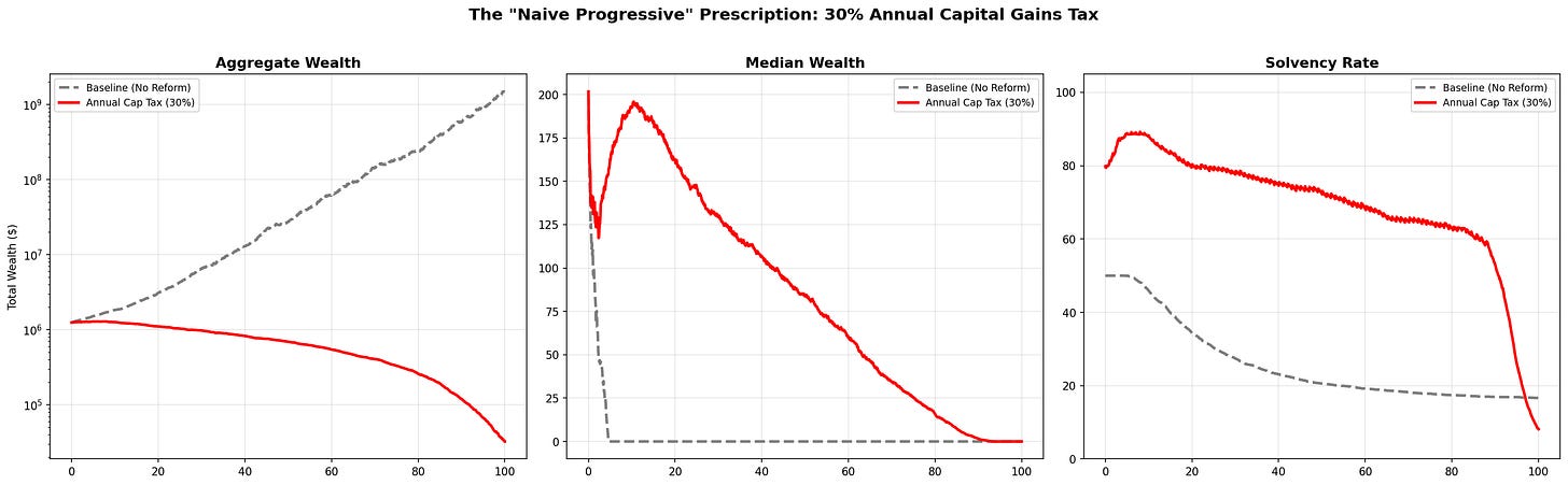 A 30% annual tax on capital gains doesn’t just redistribute wealth. It destroys the compounding mechanism itself. Every year, the tax skims 30% of any positive return. This is equivalent to reducing the effective return on capital from 8% to approximately 5.6% — but with a critical asymmetry: the tax takes on the upside, but the agent bears the full downside.