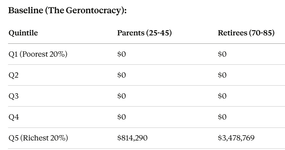 In the baseline, Q1 through Q4 have nothing. The bottom 80%, parents and retirees alike, are pinned to zero. All the wealth sits in Q5, and within Q5, the retirees hold 4x more than the parents. This is the Gerontocracy. This is the buffer-ocracy. This is America in 2026.