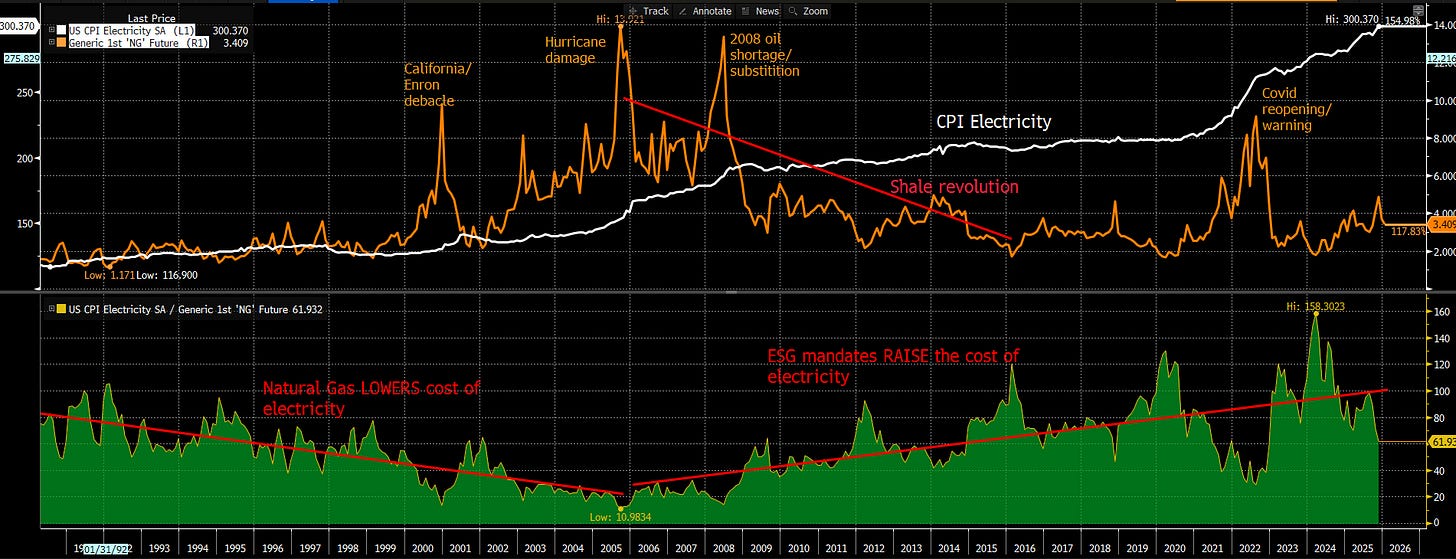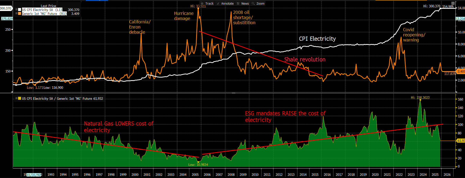 As the chart above illustrates, the cost of Electricity (White Line) has largely decoupled from the cost of Natural Gas (Orange Line).