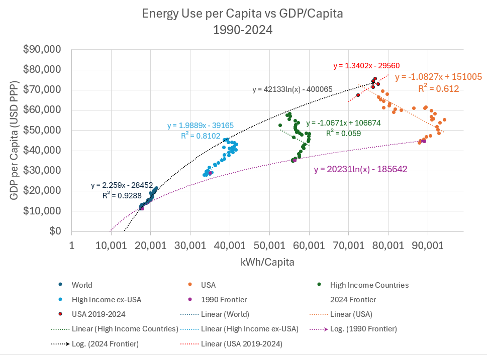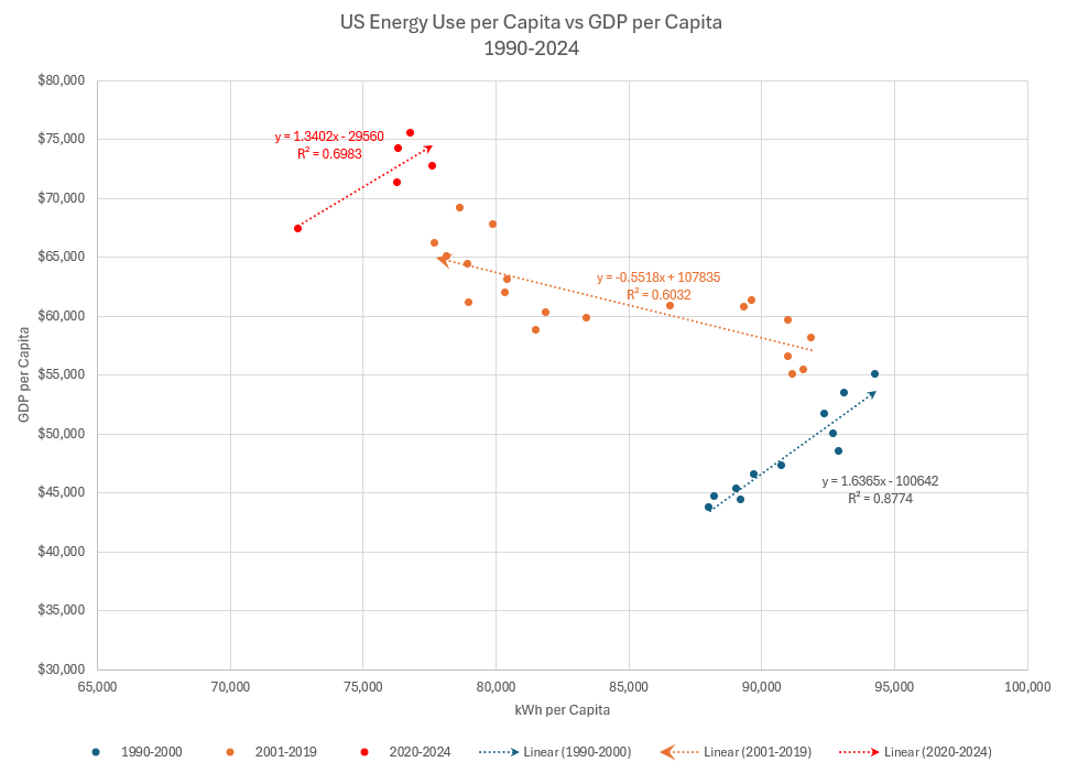For twenty years (2000–2019), the US economy pulled off a magic trick. We grew GDP while keeping energy consumption flat. This was the “Negative Slope” anomaly.