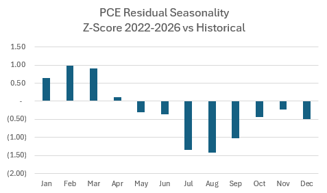 A “disappointing” inflation report reinforced a few key themes. First, remember that “residual seasonality” has corrupted the seasonally adjusted inflation data we receive. As a result, CPI is overstated in Q4 & Q1 and understated in Q2 & Q3. The February PCE and March CPI captured the two largest seasonal impact months; that is over now.