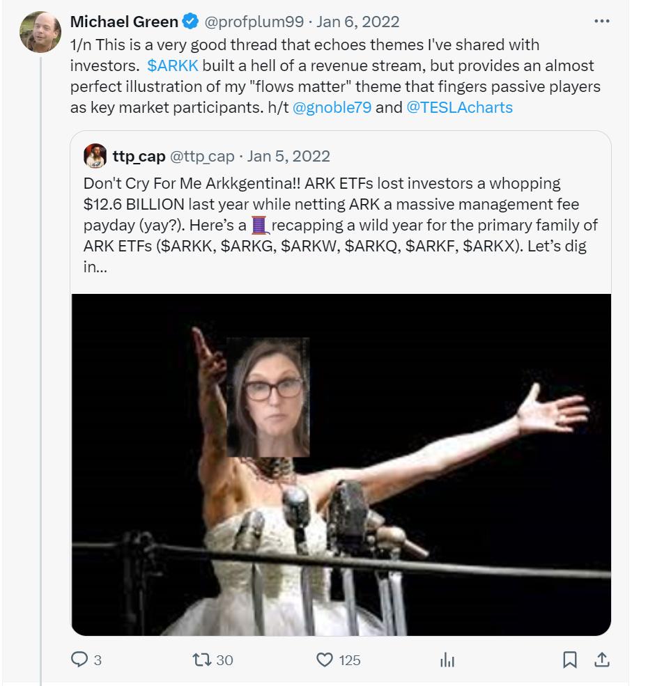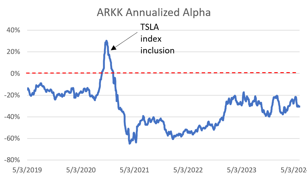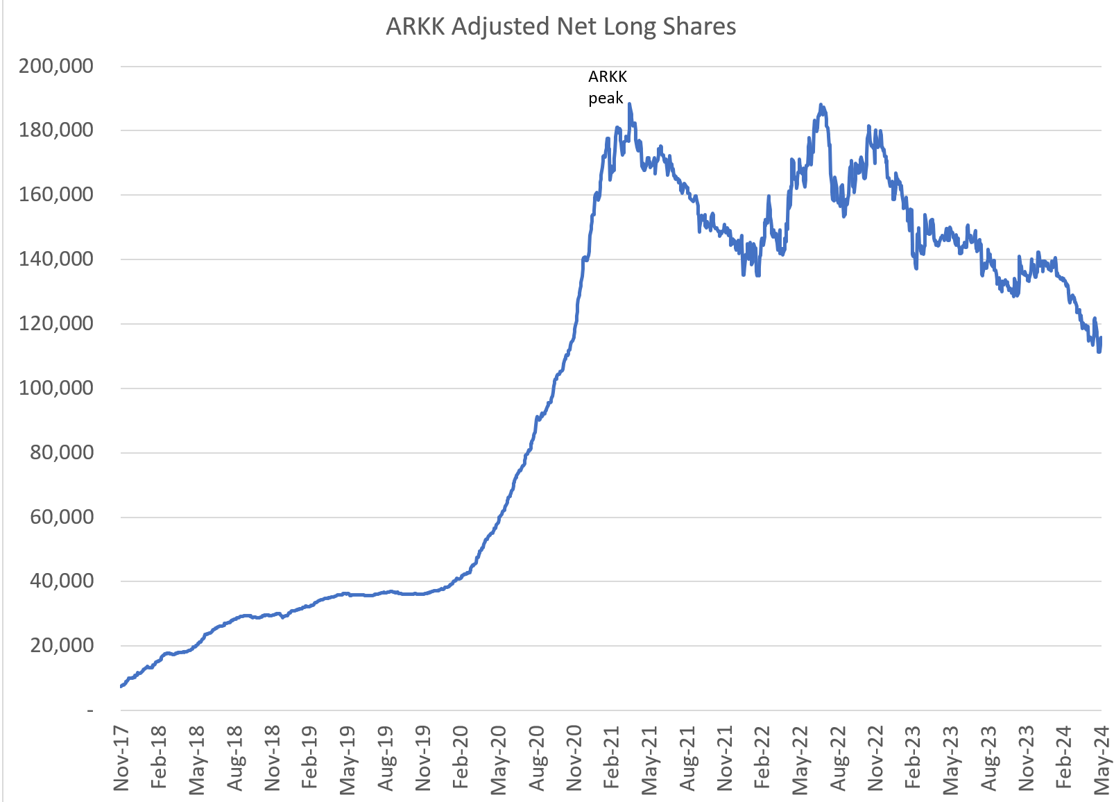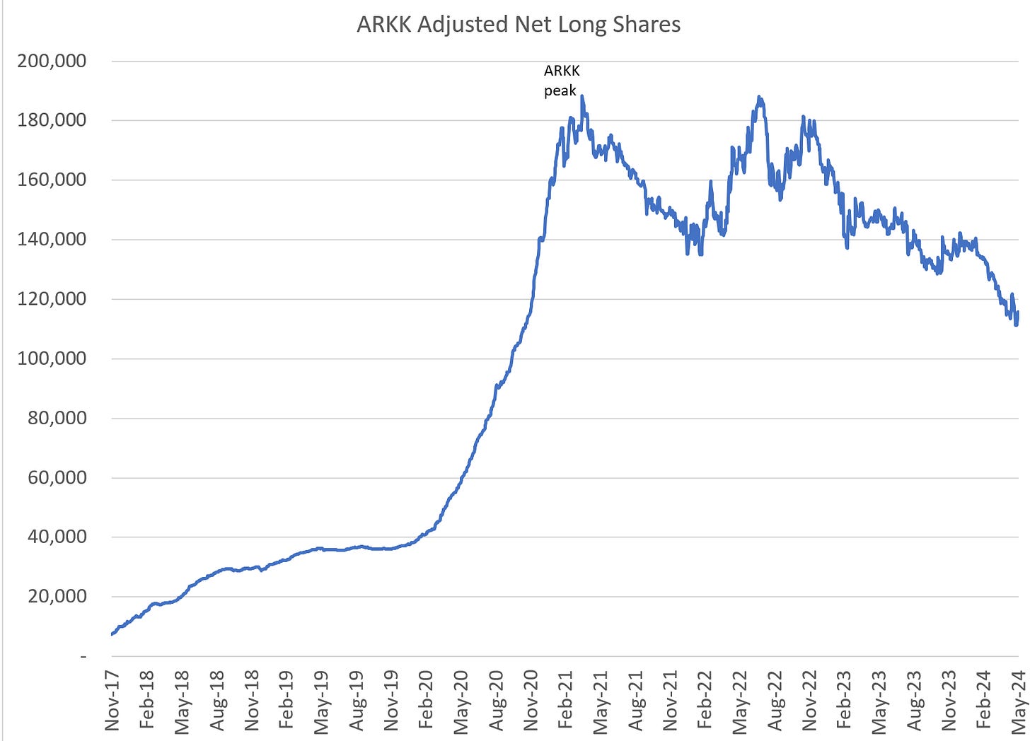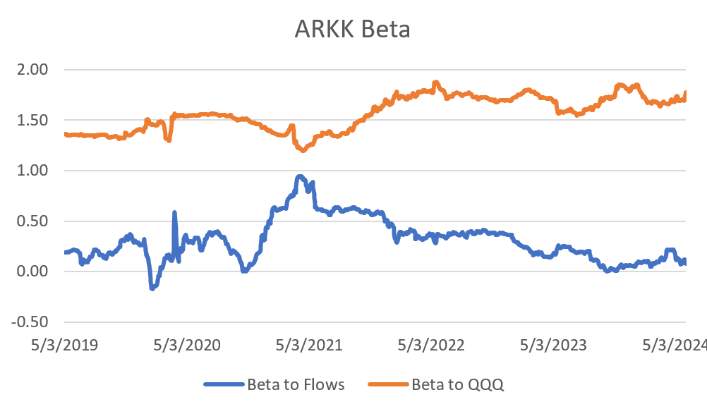 Flows drove ARKK performance: My analysis of ARKK's performance was driven by three components: a negative alpha (poor stock-picking skills), a greater than 1.0 beta to the QQQ (market beta), and a significant flows beta, indicating that new investor inflows significantly impacted returns. The analysis results have now been almost perfectly replicated by academics as part of a broader “flow impact thesis”