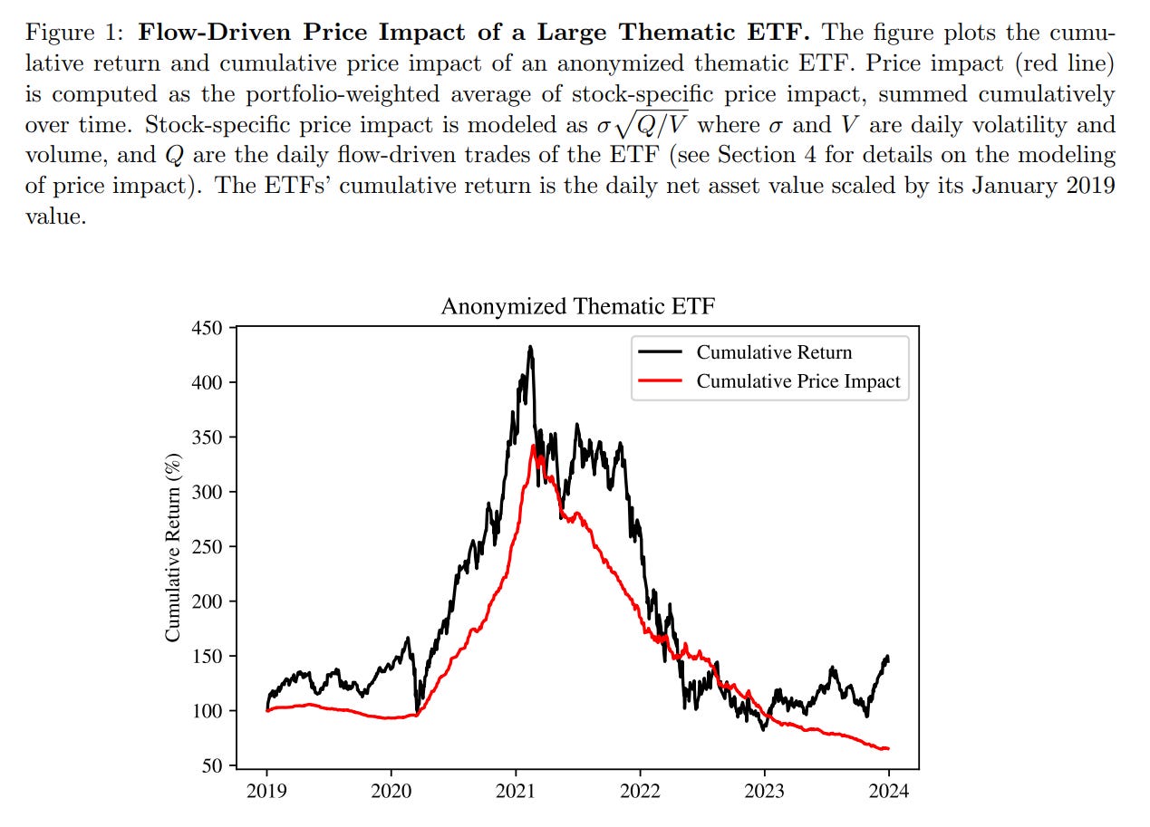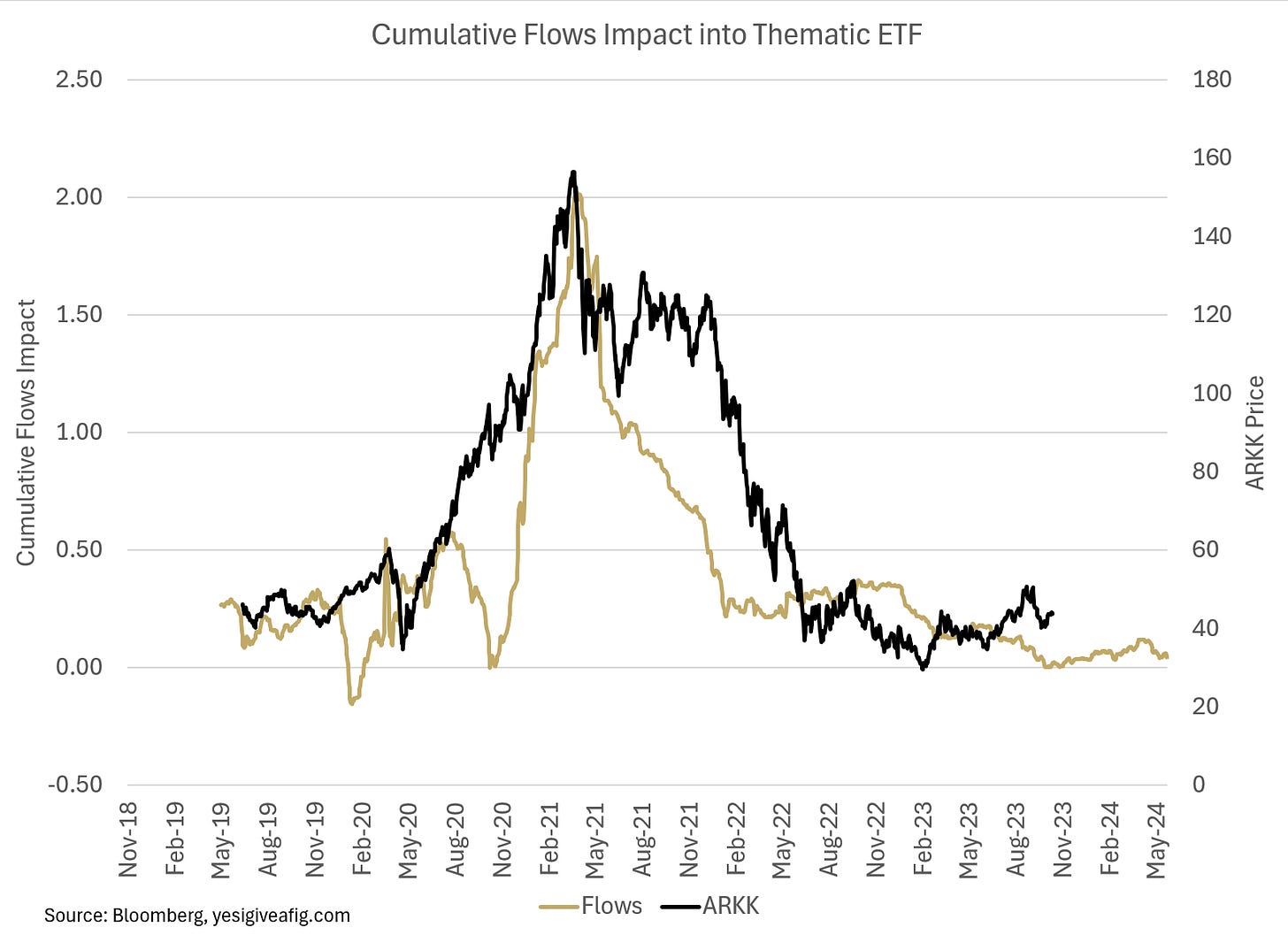 Impact of Flows on Returns: The recent paper by Van der Beek and Bouchaud confirmed the substantial role of flows in driving returns, particularly in thematic, concentrated ETFs like ARKK. Their findings showed that large inflows could create a positive feedback loop, leading to significant price impacts due to the high concentration of holdings.