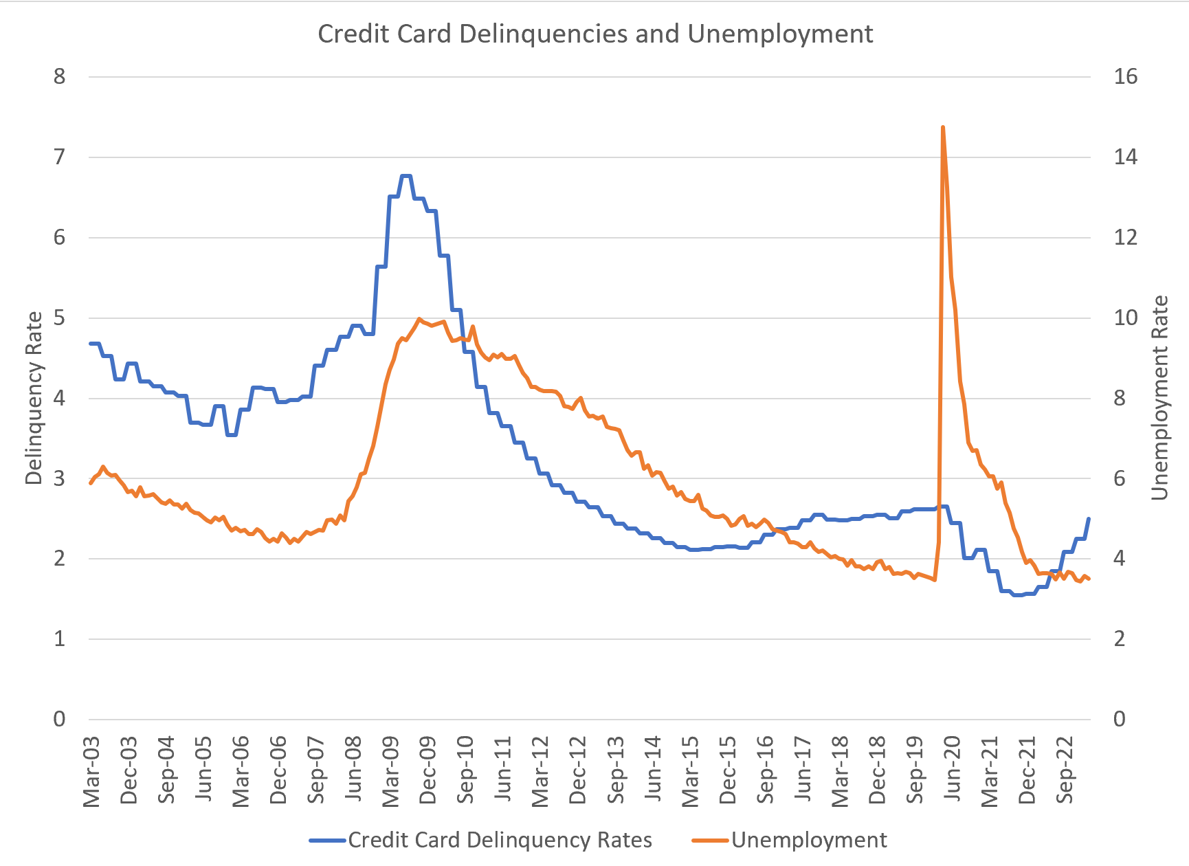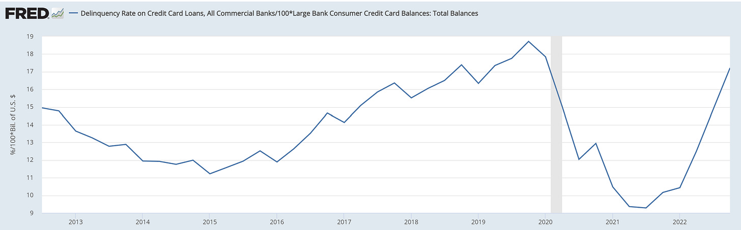 Against this pattern of historical growth, the current decline in deposits is even more extreme, and a reasonable hypothesis is that we’ll decline at an accelerating rate from here. On the credit front, bankruptcies are beginning to rise sharply, and commercial real estate is in the toilet; credit card delinquencies are now lifting rapidly. Those bullish on the economy will correctly note that these delinquencies are occurring from a low level, but with balances dramatically higher, the absolute LEVEL of delinquencies is approaching a recent record and rising at a record $ pace: