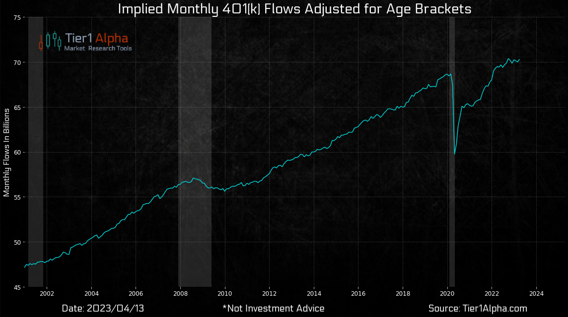 Meanwhile, equity markets are largely incapable of looking forward due to the constant flows into passive funds from 401K contributions — this flow is starting to falter with layoffs in the high-wage technology sector lowering contributions:
