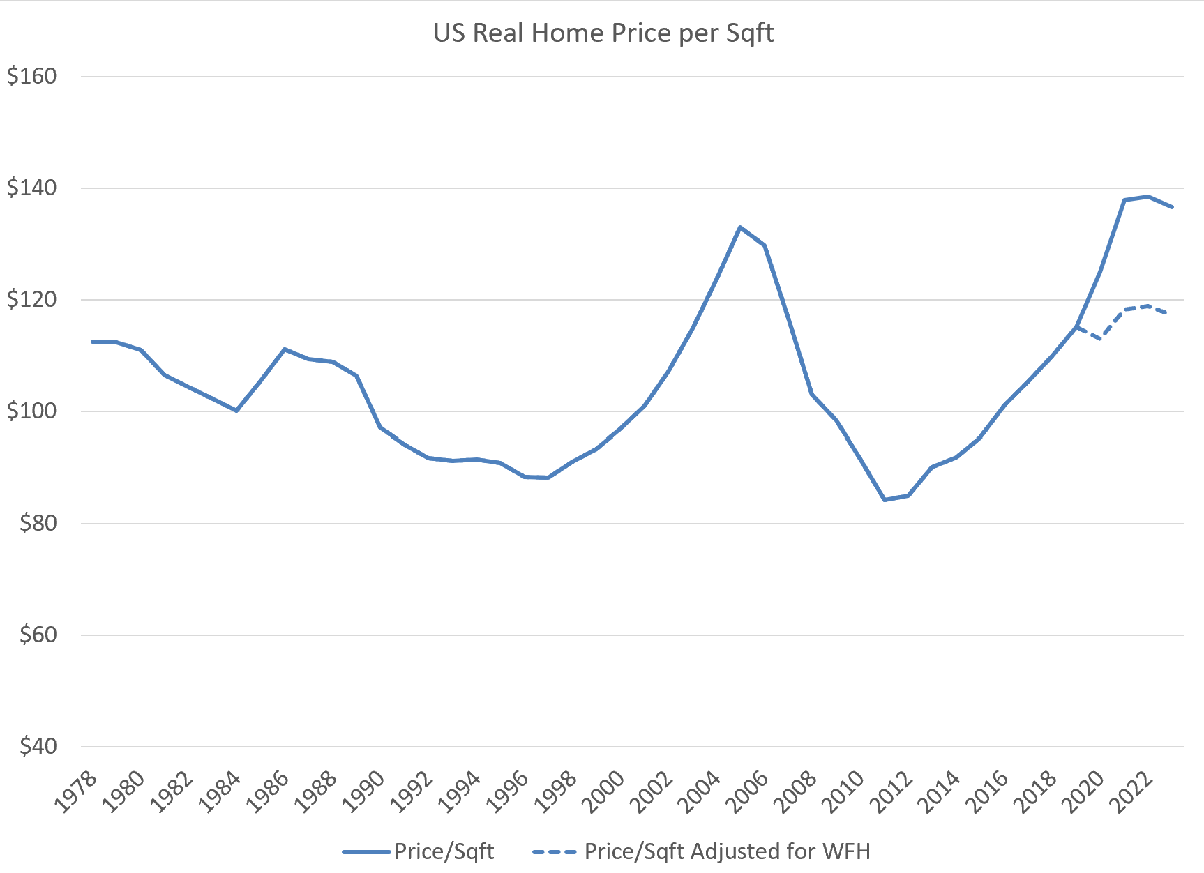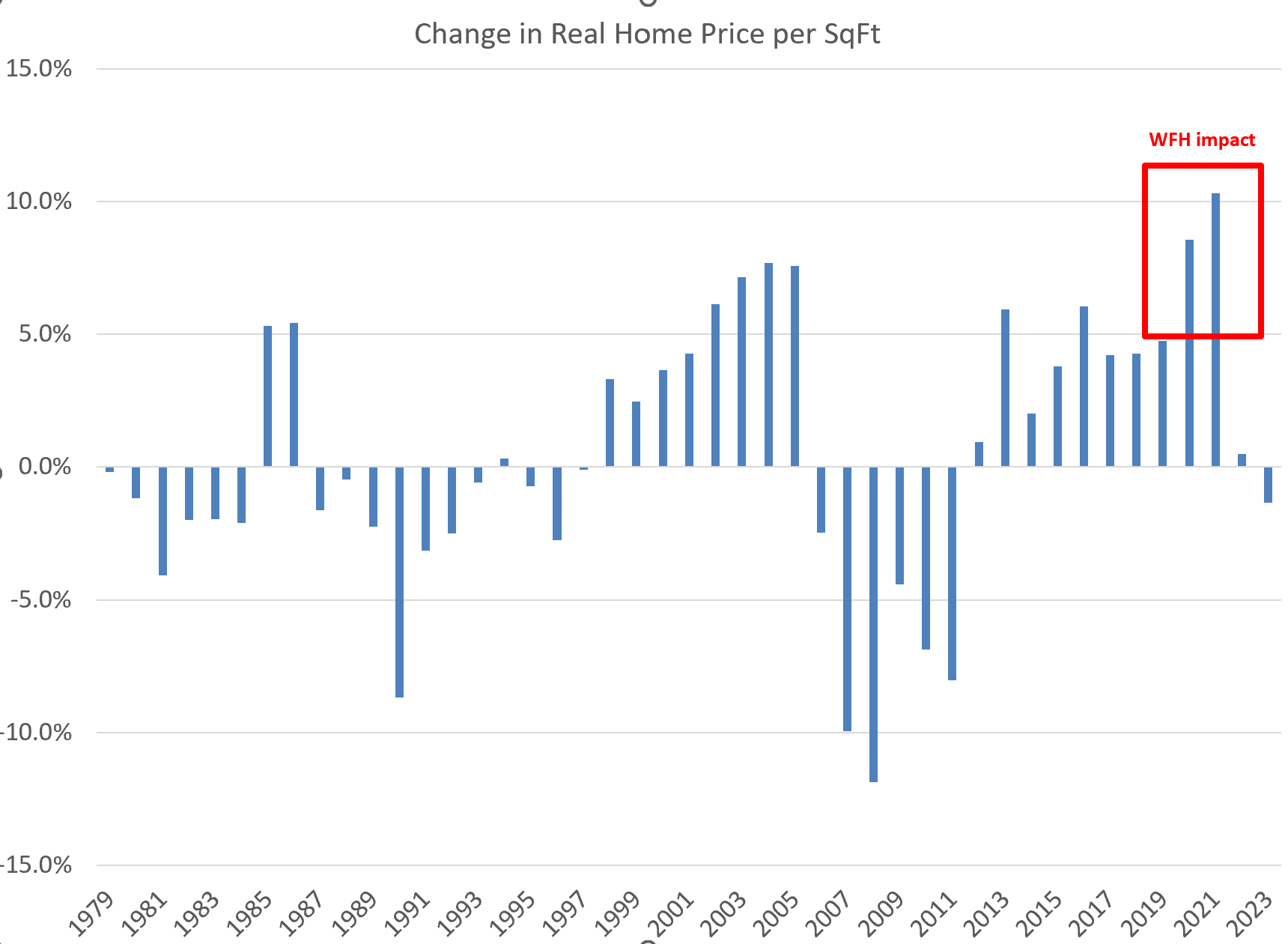 Over the last few years, the utility of the home has exploded as work-from-home became a reality. The San Francisco Fed examined the question of the impact of work-from-home on home values and found that over half the change in home prices over 2020-2022 was tied to the phenomenon: