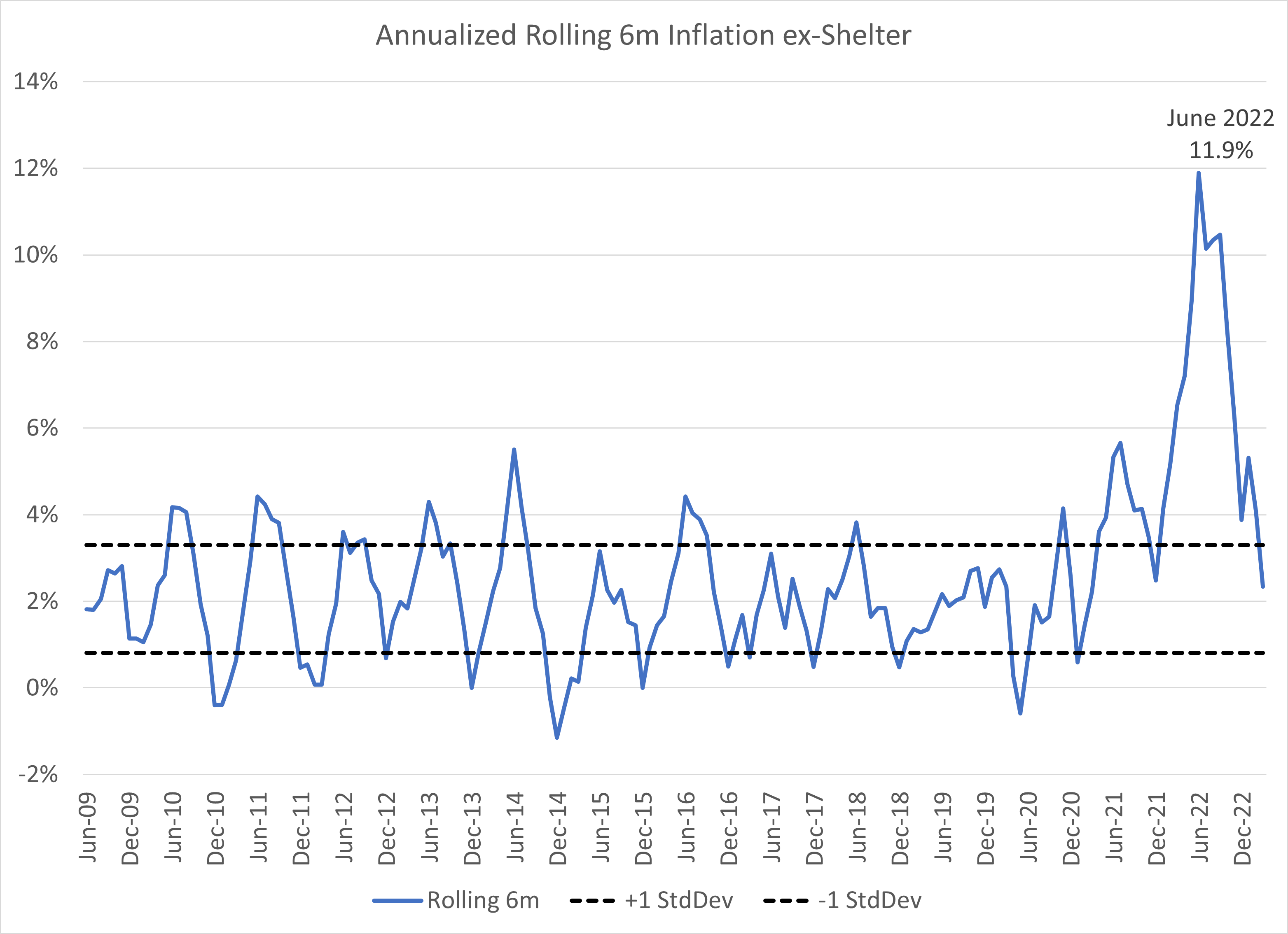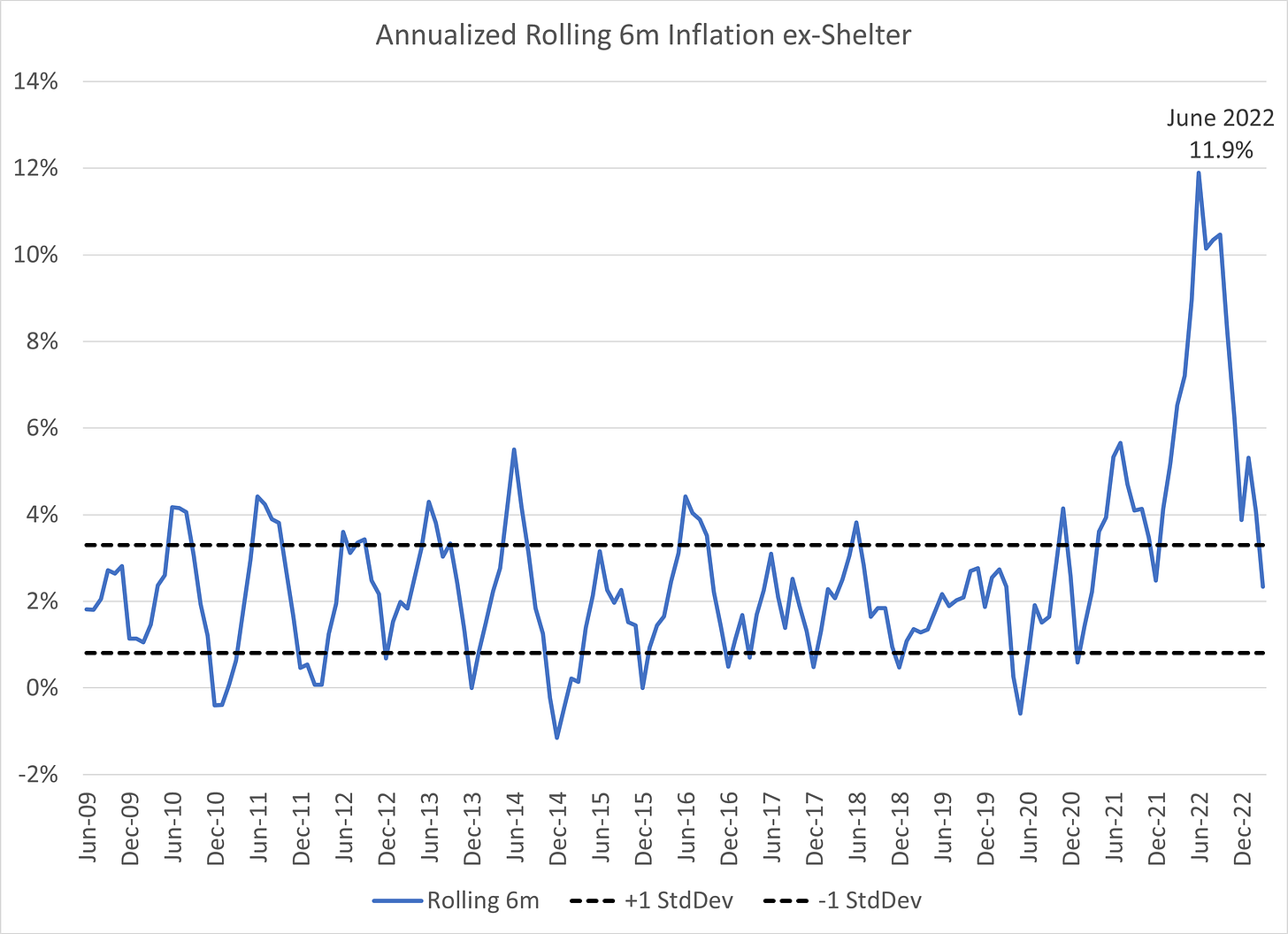 We’ve spent much of the last decade learning new economic terms. I still remember my first brush with the phrase “macroprudential” in 2010. The ease with which these words enter the financial lexicon never ceases to amaze me, but rarely do we stop to consider whether we are using them correctly. In the past three years, the phrase “transitory inflation” has become a perceived indicator of IQ — utter it, and you’re immediately maligned in roughly the same manner as those who refused to double-mask in 2020. And yet… much like an outbreak of chocolatey-goodness around Hershey, PA… the phrase seems, at least to me, to accurately describe the recent experience. From January 2022 until March 2023, a total of 13 months, we experienced elevated inflation excluding the shelter component: