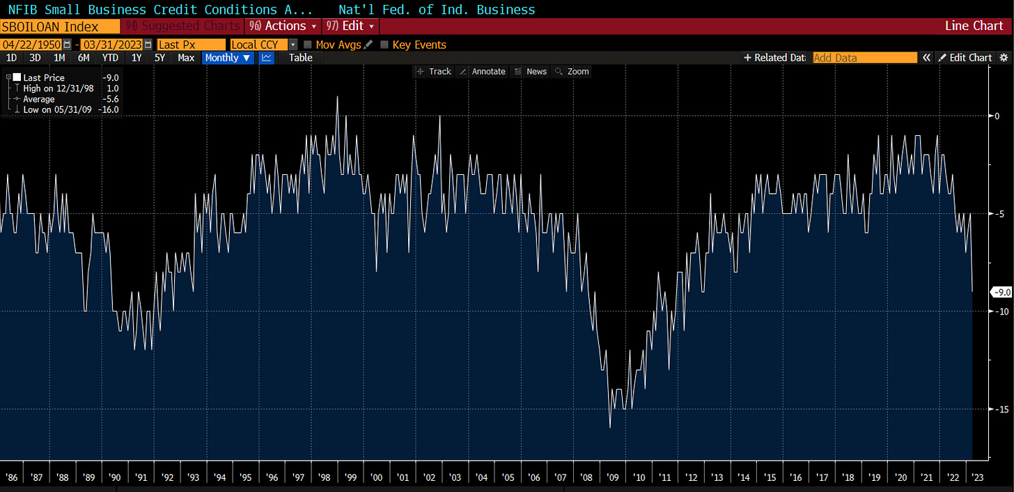 Unfortunately, Powell’s arrogance and desire to achieve immortality as the second coming of Paul Volcker means we now have an unelected bureaucrat apparently on an unannounced mission to “end the Fed put” as discussed in last week’s note. In the very brief dataset since that event, we’re seeing credit availability collapse for small businesses in the second largest decline in the NFIB’s credit availability conditions index history — tied with the events of 9/11: