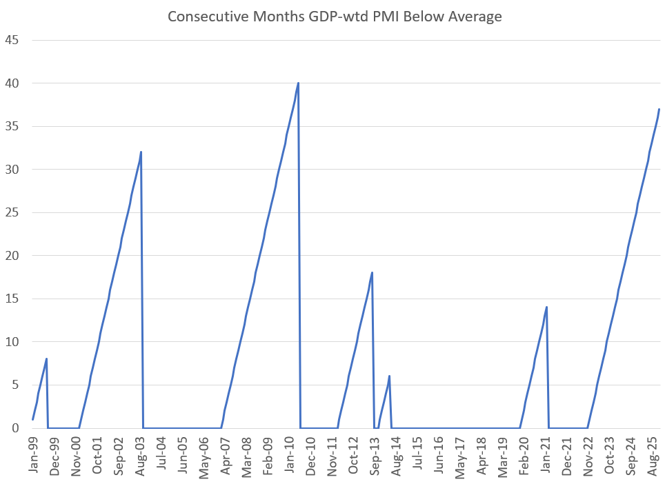 Could I be wrong? Of course. If I’m wrong, it will be because the private sector recession ends. We are absolutely seeing a rebound in the cyclical sectors, with a moderate rebound in new orders. We have been in the longest period of GDP-wtd PMI New Orders weakness since the GFC: