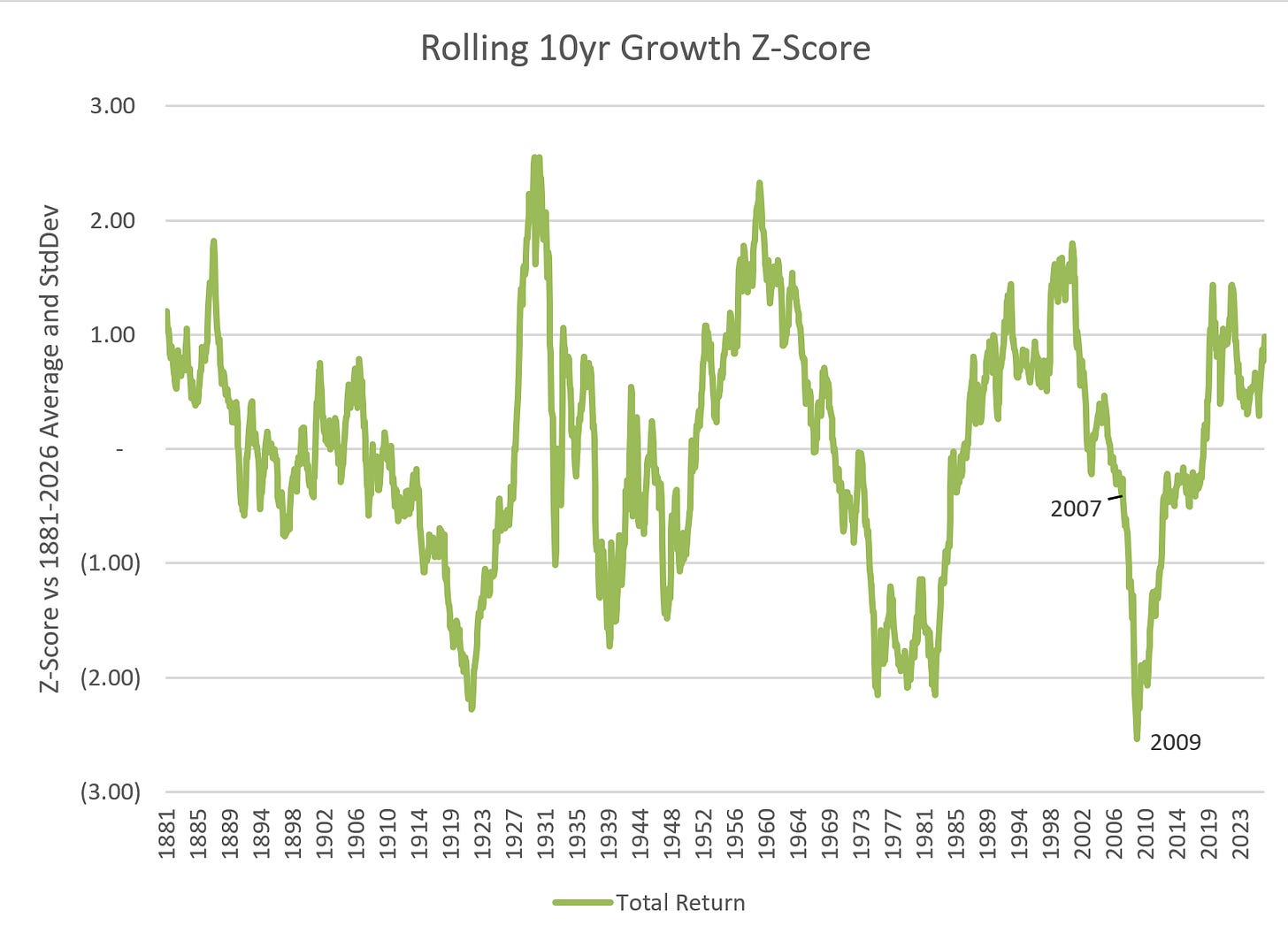 My expectation was that a cyclical peak in profitability (then driven by financials and energy) was turning lower and likely to result in much lower than expected EPS. Obviously, I was right in 2008, but it was nowhere near as smooth as my simple forecast implied. In fact, the total return for the S&P500 for the 10yr ended March 2009 was the worst in history, eclipsing the post-WW1 crash. As you might expect, given the mean-reverting nature of this series, we rebounded sharply in 2009.