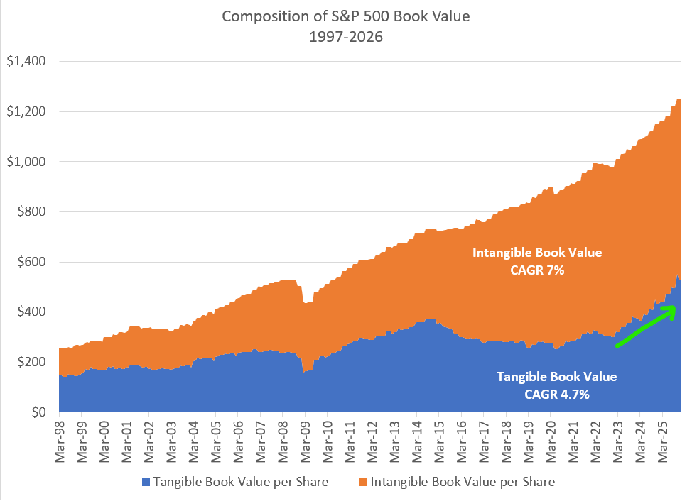 As a result, we’ve seen book value, largely in the form of intangibles, explode. But consistent with our writings over the past few weeks, the rate of TANGIBLE book value growth has accelerated sharply with the emergence of AI spending. Once again, an indication that the physical world is starting to intrude into our financialized fever dream: