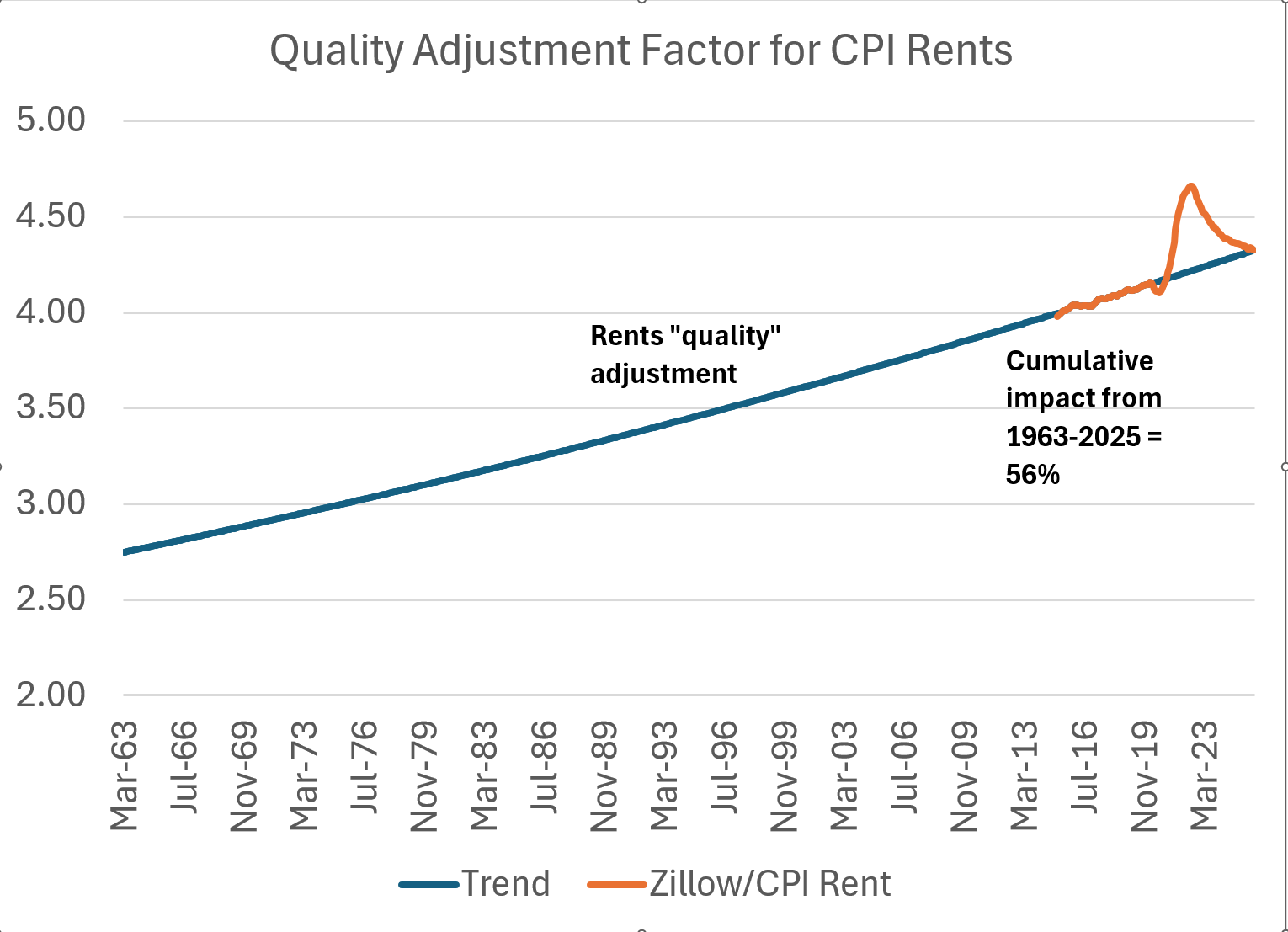 The hedonic deflation of the CPI rent factor has now normalized against private sector measures like Zillow rents. From here, we should expect Zillow rents to remain below CPI rents as an aging housing stock is “artificially” inflated with hedonics: