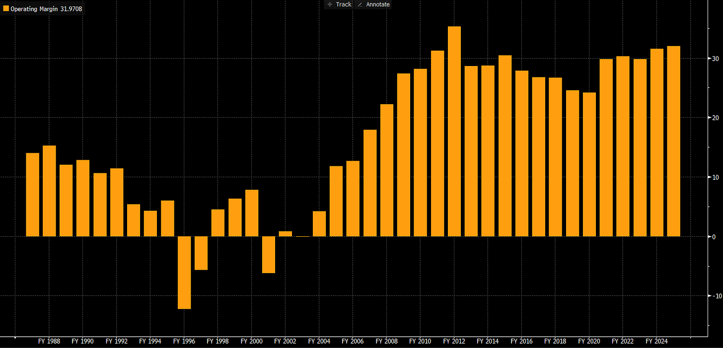 It’s possible you remember this time period. By December 2012, Apple’s revenues had risen 500% over the preceding three years, and earnings were up 10x. Multiples? AAPL P/E, unadjusted for the massive cash on its balance sheet, was single digits. Apple’s operating margin hit its all-time peak that year: