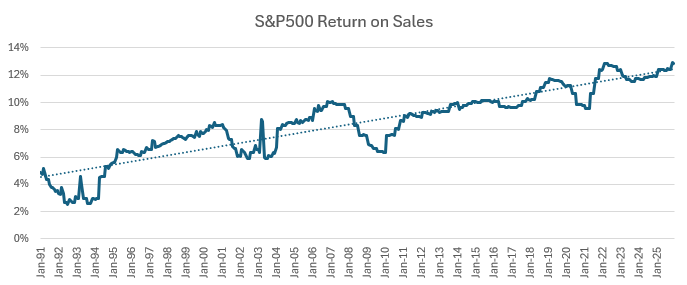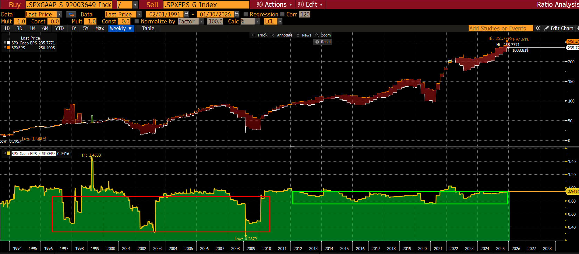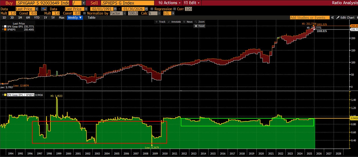 Few were paying attention. David Einhorn was, but his value discipline led him to sell too soon. Most were too busy preparing for the collapse of the EU, driven by Greek and Spanish defaults. The debate in 2026 seems very similar to the pre-2007 period, except this time it’s the tech co’s that are “overearning”; and like financials in 2007, we won’t know until the write-offs occur. The post-GFC era has been unique for the lack of write-offs. We can see this in the relationship between GAAP EPS (Generally Accepted Accounting Principals) and reported EPS from continuing operations. Write-offs cause the relationship to plunge, and there have been very few: